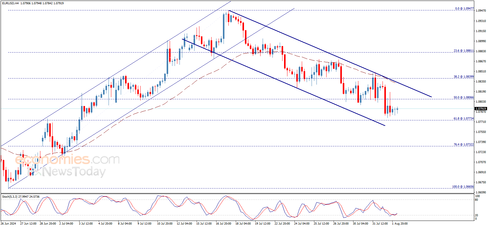 أنهى سعر اليورو مقابل الدولار تداولات يوم أمس دون مستوى 1.0806$، ووصل إلى مشارف الهدف الجديد المنتظر عند 1.0774$، مع الإشارة إلى أن السعر يتحرّك ضمن قناة هابطة تدعم فرص كسر هذا المستوى وفتح الطريق أمام تحقيق أهداف سلبية إضافية تصل إلى 1.0732$.