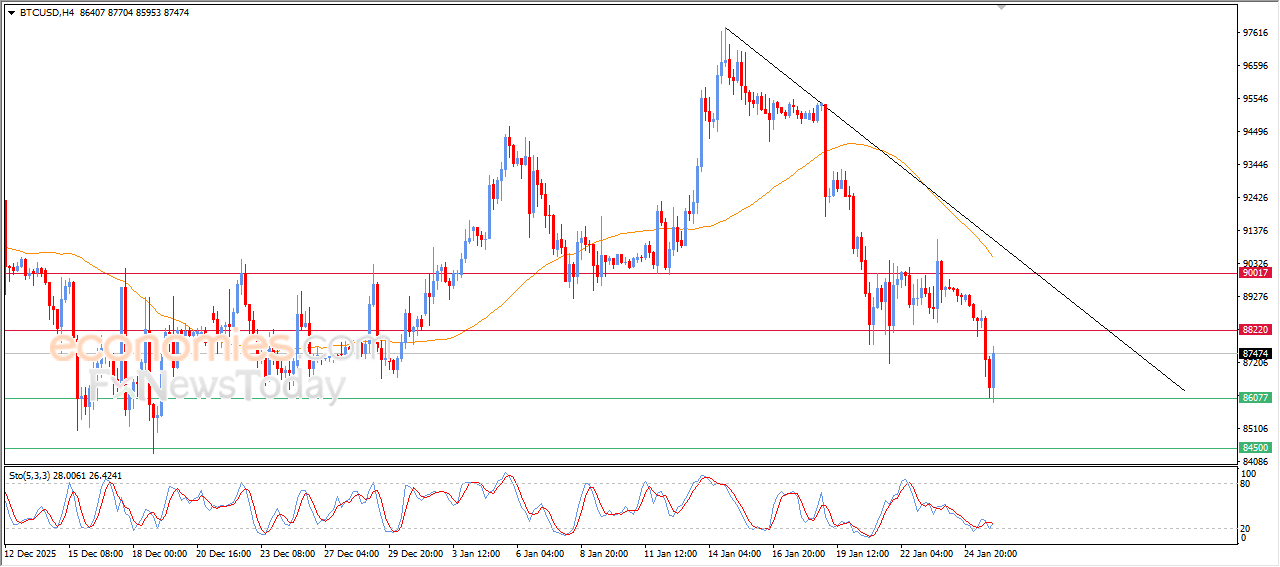 صعد سعر البتكوين (BTCUSD) بتداولاته اللحظية الأخيرة، مستفيداً من تماسك مستوى الدعم 86,000$، والذي كان هدفاً سعرياً لنا في تحليلاتنا السابقة، ليحاول السعر من خلال هذا الارتداد تعويض جزء من خسائره السابقة، بالتزامن مع محاولاته تصريف جانب من تشبعه البيعي الواضح بمؤشرات القوة النسبية، خاصة مع بدء ظهور تقاطع إيجابي يعكس تحسناً مؤقتاً في الزخم.