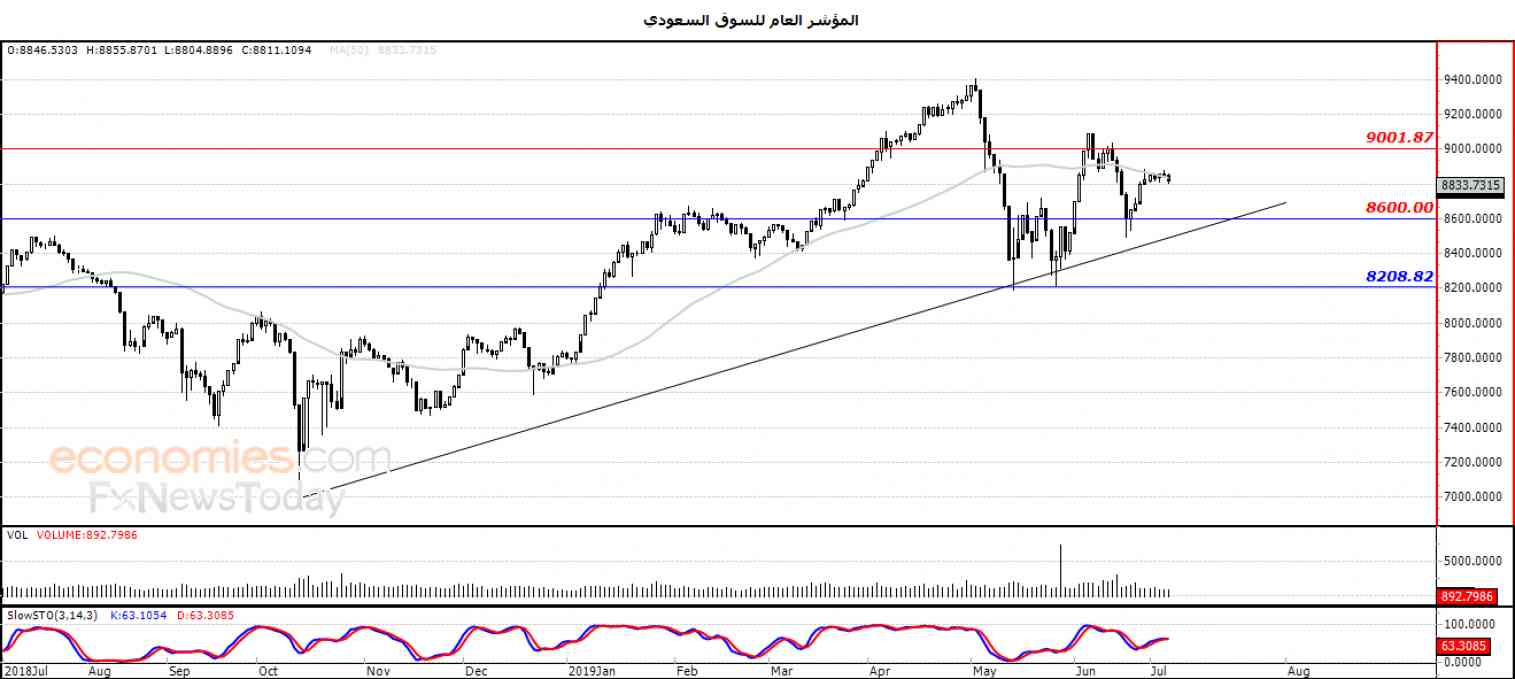 للجلسة الثانية على التوالي انخفض المؤشر العام للسوق السعودي (TASI) ، ليسجل خسائر جديدة بلغت نسبتها -0.40% بما يعادل -35.42 نقطة ، وذلك على اثر ملامسته لمقاومة المتوسط المتحرك البسيط لفترة 50 يوماً السابقة ، ليحاول اكتساب زخماً إيجابياً قد يساعده على الارتفاع من جديد ، في ظل توارد الإشارات الإيجابية بمؤشرات القوة النسبية ، مع سيطرة الاتجاه الرئيسي الصاعد على المدى المتوسط بمحاذاة خط اتجاه .