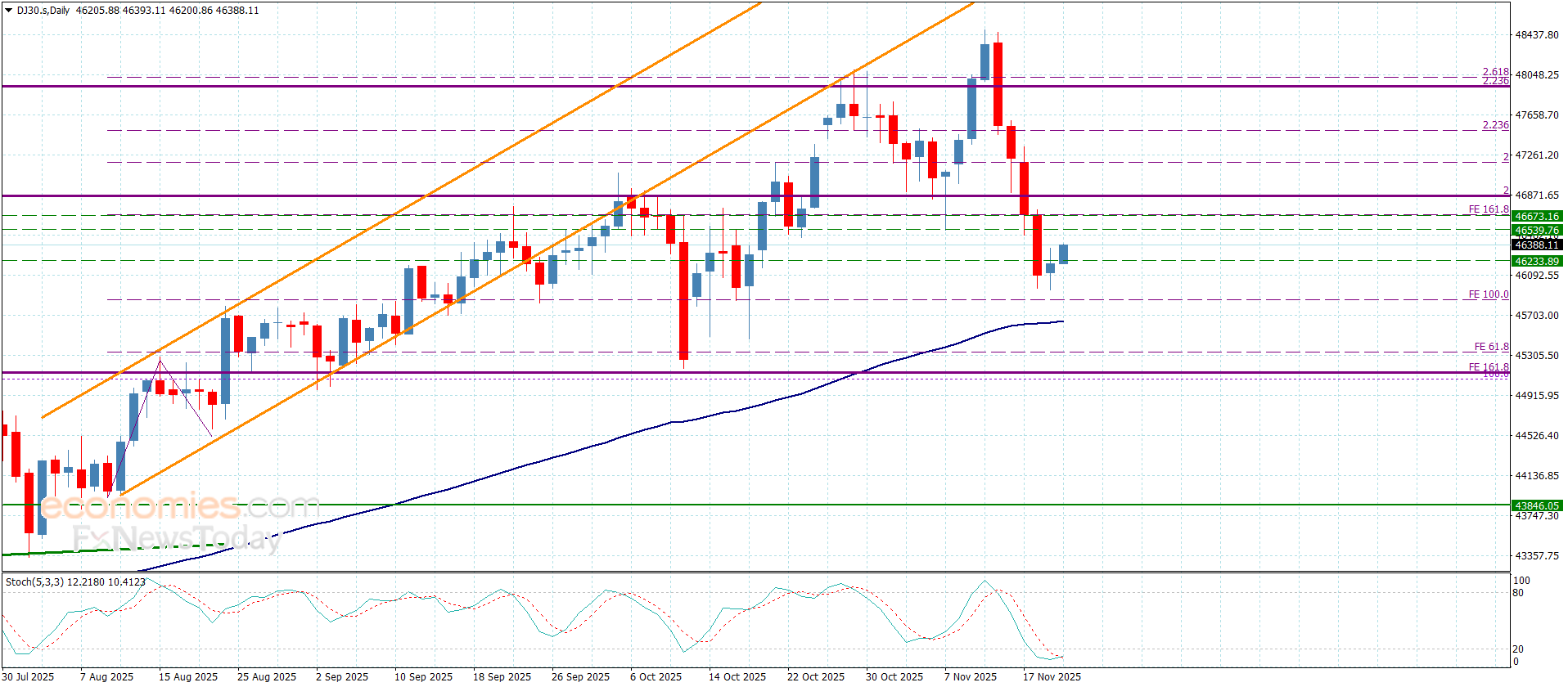 حاول سعر المؤشر تعويض بعض الخسائر بعد ملامسته لمستوى 45950 لنلاحظ تشكيله لاندفاع تصحيحي صاعد واستقراره قرب 46425 متأثرا بمحاولة خروج مؤشر ستوكاستيك من مستوى تشبع البيع.