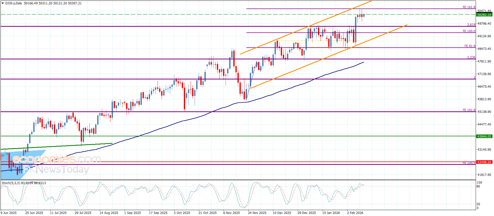 نؤكد على أهمية تجميع السعر للعزم الإيجابي لعزز ذلك فرص تجاوزه لمستوى 50575 ليبدأ بتسجيل مكاسب تاريخية جديدة قد تمتد قريبا نحو 50810, أما هبوطه مجددا دون 50100 وتقديمه لإغلاق سلبي سيجبره ذلك على تفعيل محاولات جني الأرباح لنتوقع تسلله بذلك نحو 49660.