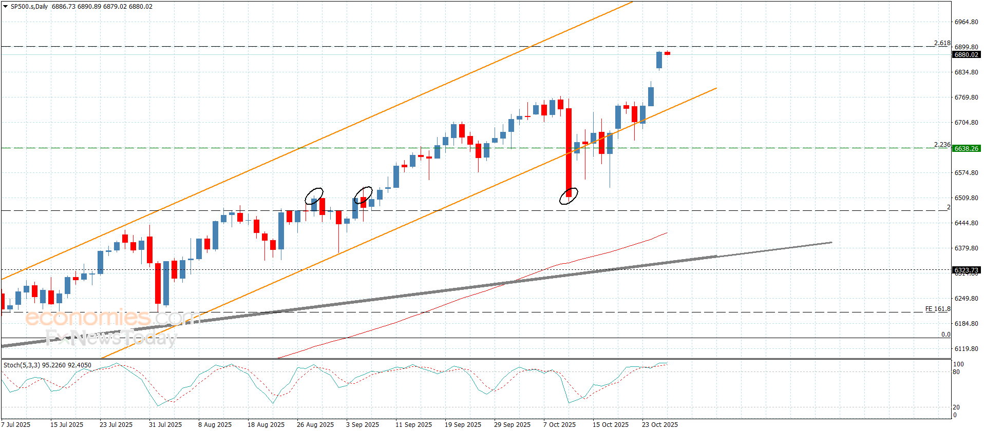 واصل سعر المؤشر منذ تداولات يوم أمس تشكيله لموجات صاعدة قوية لنلاحظ اقترابه حاليا من الهدف الرئيسي المستقر عند 6900.00 والذي يشكل بدوره مستوى 2.618% فيبوناتشي الامتدادي.