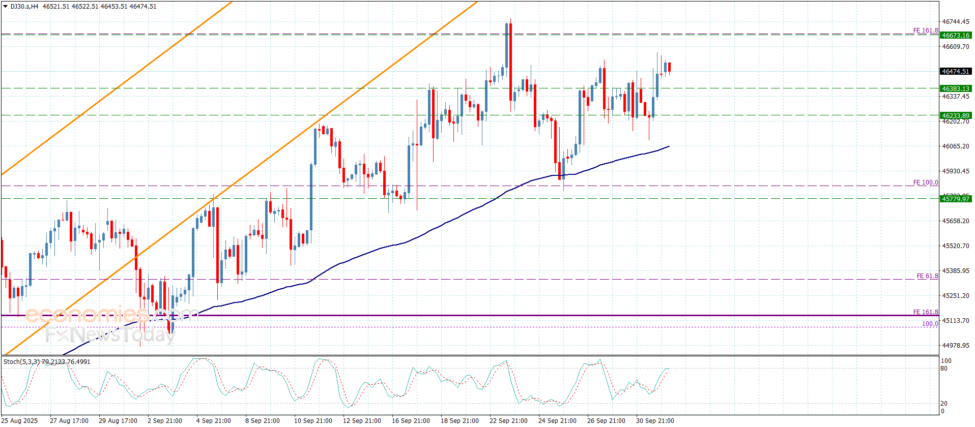 أنهى سعر المؤشر تداولات يوم أمس بتحقيقه لاختراق الحاجز المستقر عند 46380 لنلاحظ تسجيله لمكاسب ملموسة باندفاعه نحو 46575 ومن ثم ليشكل بعض التداولات الجانبية بهدف تجميع المزيد من العزم الإيجابي.