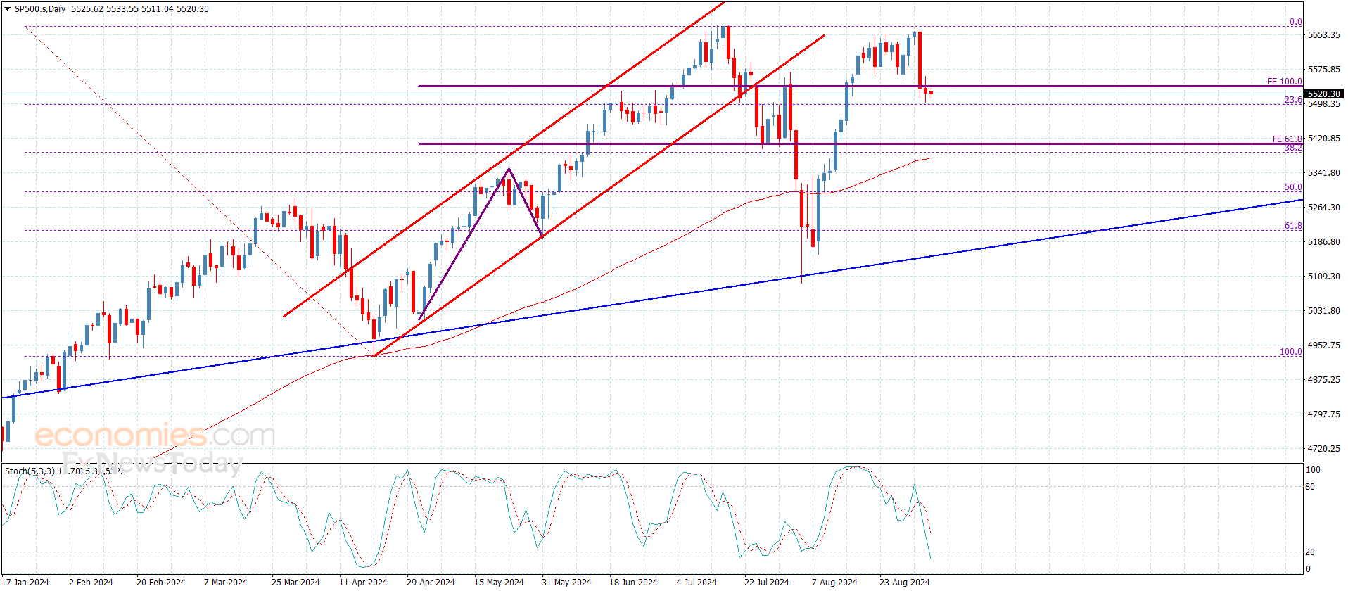 واجه سعر المؤشر بهجومه السلبي الأخير مستوى تصحيح 23.6% فيبوناتشي المتمركز عند 5500.00 ليعوق بشكل لحظي الهجوم السلبي لنلاحظ تقديمه حاليا لتداولات جانبية باستقراره قرب 5520.00.