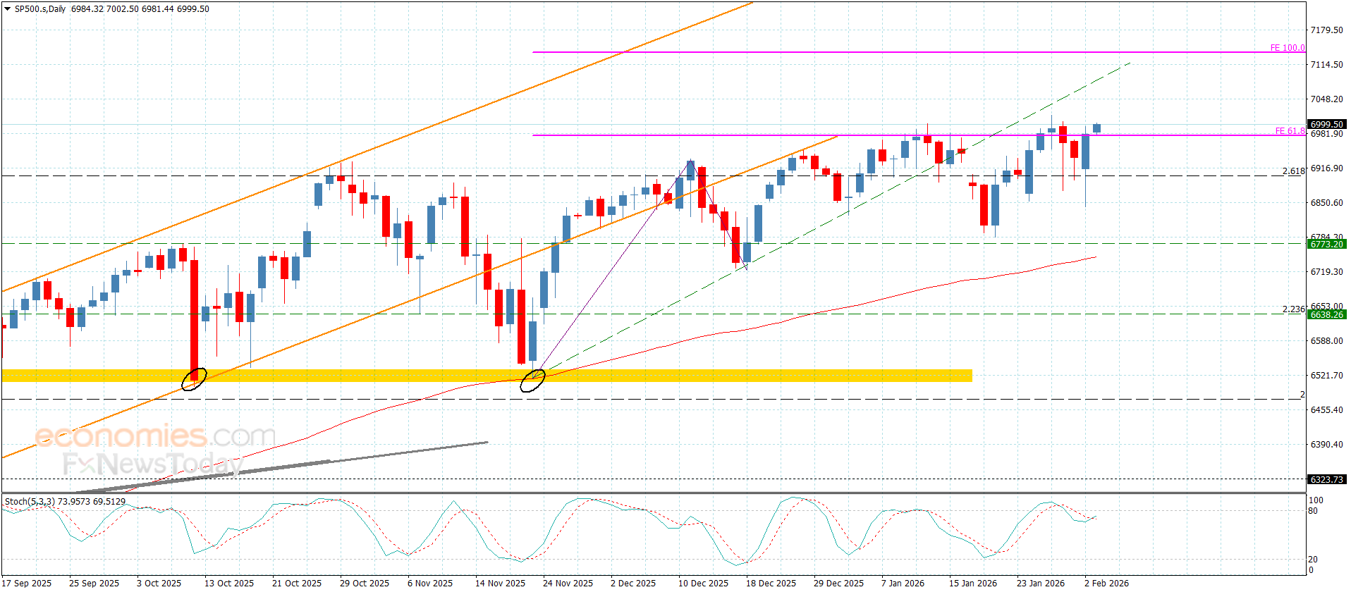 لامس سعر المؤشر بهبوطه التصحيحي الأخير المحطات المقترحة سابقا بوصوله نحو 6845.00 ليشكل ذلك عائق قوي أمام محاولات استئناف الهجوم السلبي وليمنحه فرصة لتشكيل موجات صاعدة قوية لنلاحظ استقراره حاليا قرب 7000.00 متجاوزا بذلك الحاجز الأولي المتمركز عند 6975.00.