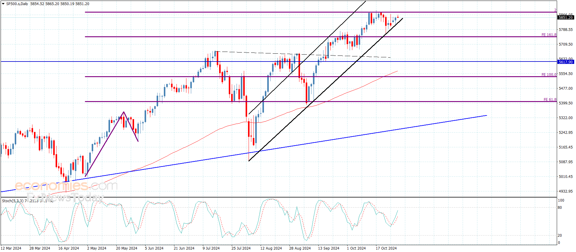 نكرر التنويه إلى أن اندفاع السعر فوق المقاومة والثبات أعلاها فإن ذلك سيفتح باب تحقيق مكاسب تاريخية جديدة قد تمتد نحو 5930.00 وصولا نحو الحاجز النفسي المتمثل بمستوى 6000.00.