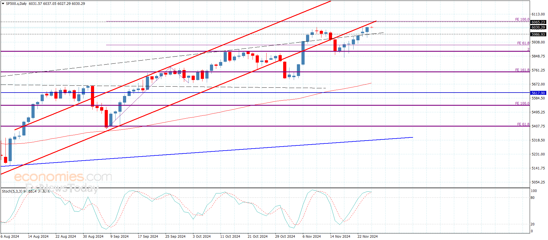 أكد سعر المؤشر تمسكه بالمسار الصاعد باختباره للقمة التاريخية وملامسته لمستوى 6037.00 إلا أن افتقاره المستمر للعزم الإيجابي والناتج عن محاولة خروج مؤشر ستوكاستيك من مستوى تشبع الشراء يدفع به لتشكيل المزيد من التذبذب الجانبي.