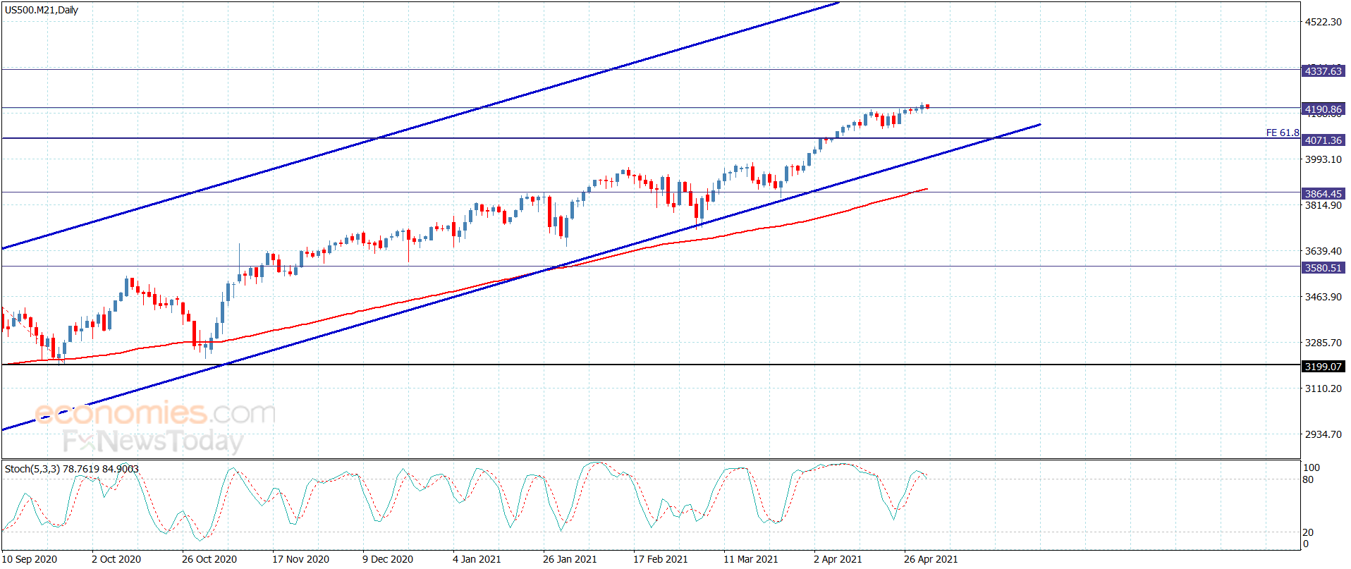 بالرغم من تشكيل سعر المؤشر يوم أمس لتذبذب جانبي مؤقت باستقراره قرب 4190.00 إلا أن ذلك لن يؤثر على المسار الرئيسي الصاعد نظرا لتمركزه ضمن محاور القناة الرئيسية الصاعدة والموضحة بالرسم المرفق.