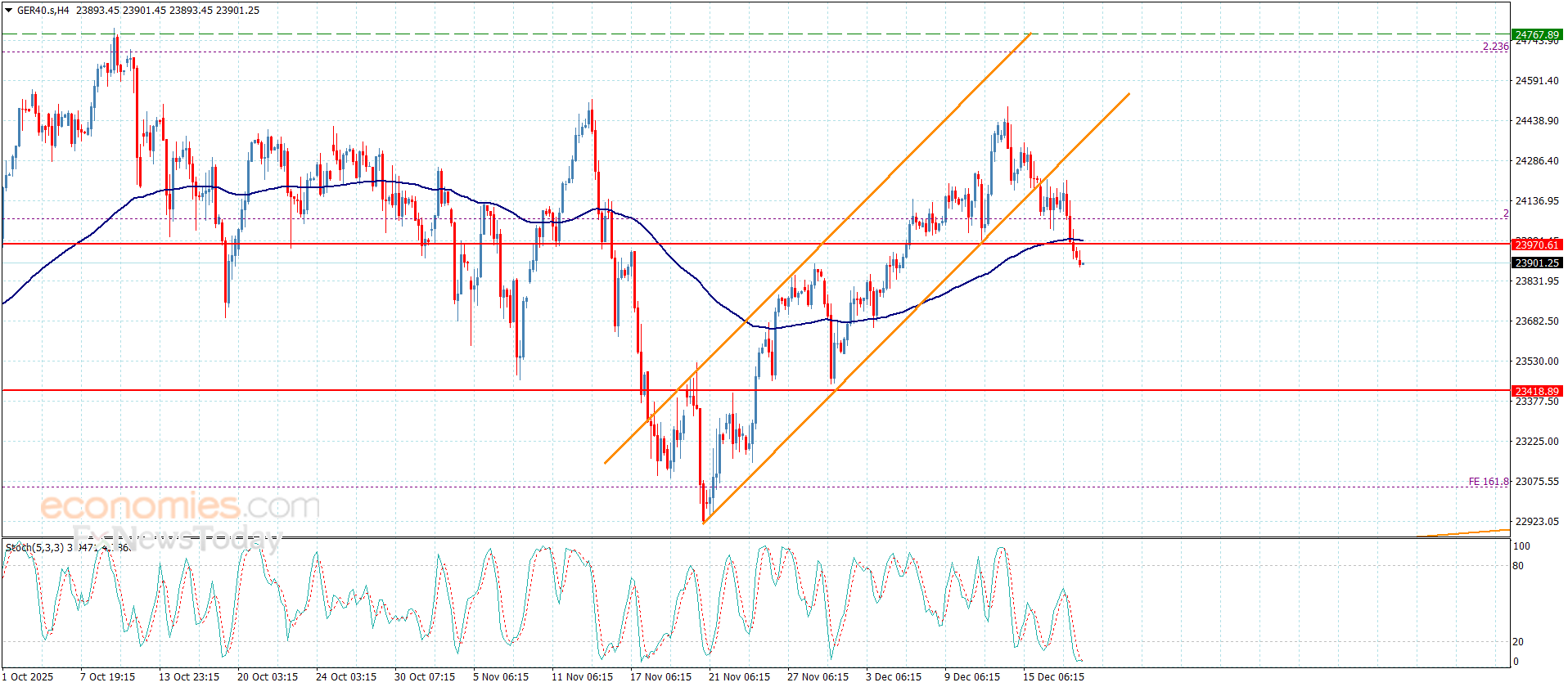 تعرض سعر المؤشر بتداولات يوم أمس لضغوط سلبية قوية نتيجة لوصول مؤشر ستوكاستيك نحو مستوى تشبع البيع لنلاحظ خروجه من محاور القناة الفرعية الصاعدة بتسلله دون مستوى 24220.00 ليضطر لتكبد خسائر كبيرة باستقراره حاليا دون الدعم الرئيسي الأول المتمثل بمستوى 23970.00.