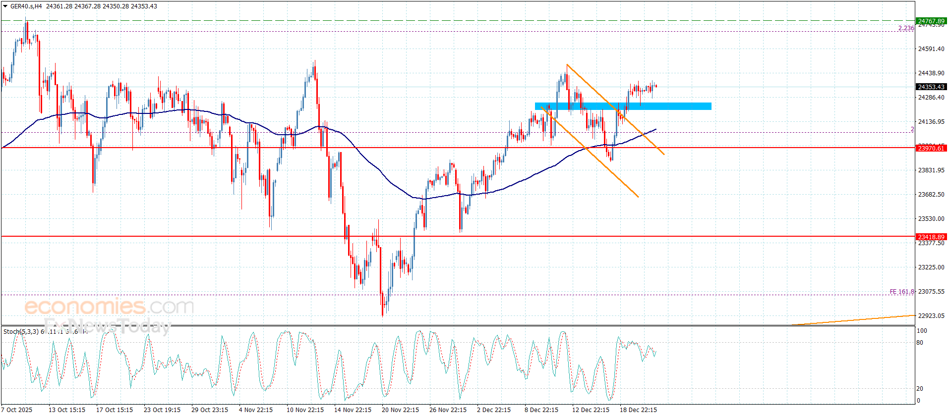نشير إلى أن اقتراب مؤشر ستوكاستيك من مستوى 80 سيمد السعر بعزم إيجابي إضافي ليسهل مهمة تسجيله لمكاسب ملموسة باندفاعه قريبا نحو 24520.00 ومن ثم ليحاول الضغط على الحاجز المستقر عند 24685.00 بهدف إيجاد منفذ لتسجيل مكاسب تاريخية جديدة.