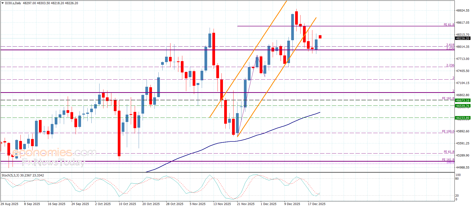 نجح سعر المؤشر بالتصدي للضغوط السلبية وتقليص أثر سلبية المؤشرات الرئيسية بتقديمه لإغلاق جديد فوق مستوى الدعم الإضافي المتمركز عند 47940 لنلاحظ محاولة تعويضه لبعض الخسائر باندفاعه نحو 48300.
