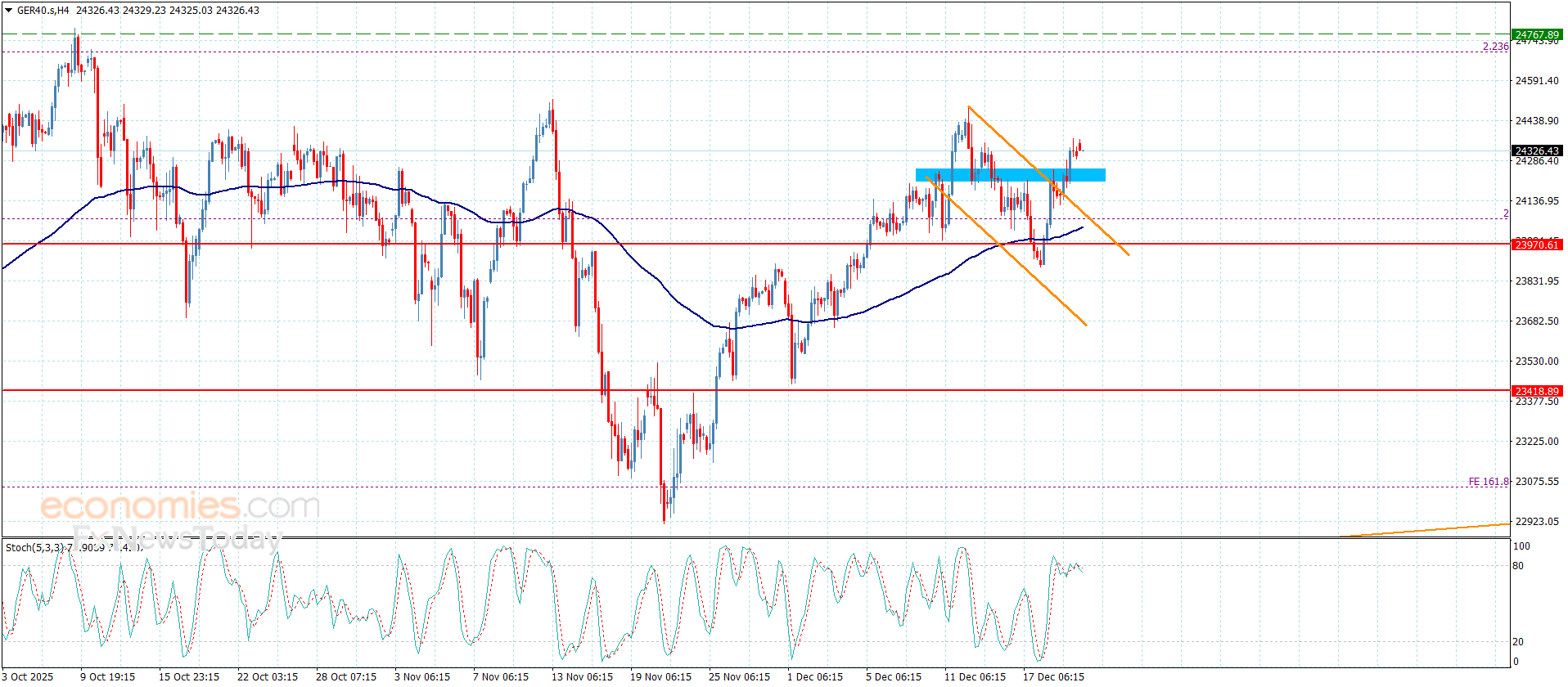 تعرض سعر المؤشر بتداولات يوم الجمعة لضغوط إيجابية قوية ليمكنه ذلك باختراق مقاومة القناة الفرعية الهابطة والمتمثلة بمستوى 24190.00 لنلاحظ تجاوزه بذلك للعائق الإضافي المتمركز عند 24255.00 والبدء بتسجيل مكاسب بوصوله نحو 24370.00 تقريبا.