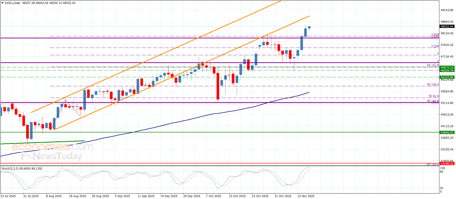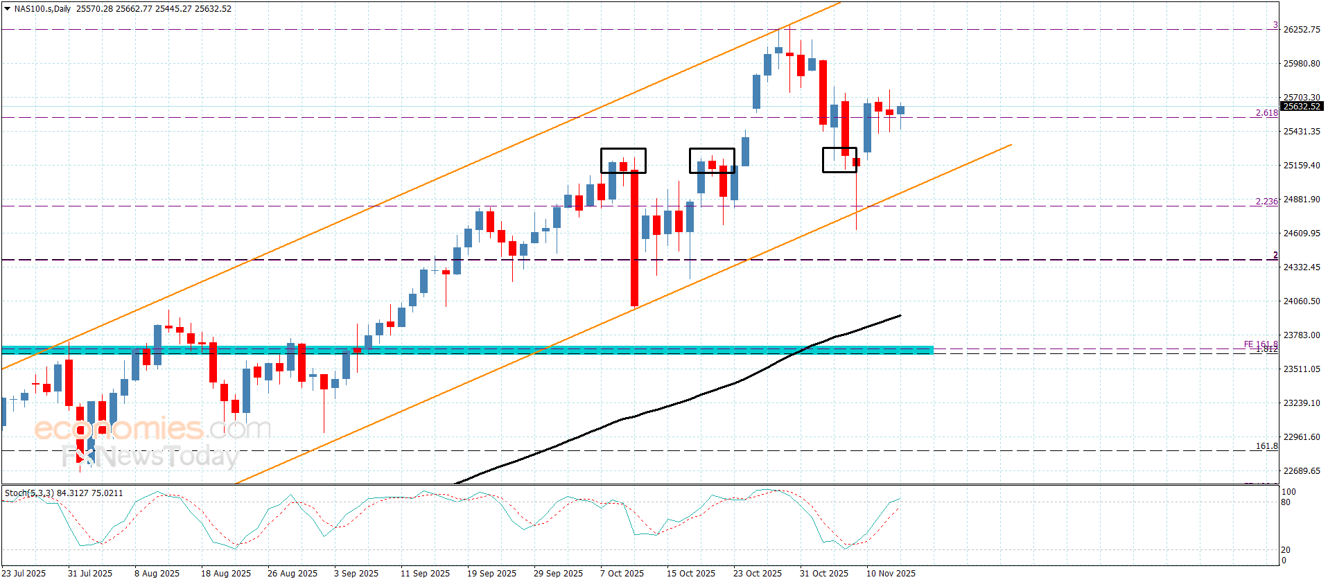 فالثبات العام ضمن محاور القناة الصاعدة وبمحاولة ثبات السعر حاليا فوق مستوى 2.6180% فيبوناتشي الامتدادي المتمركز عند 25540.00 يعزز فرص تشكيله قريبا لموجات صاعدة جديدة لنتوقع بتجاوزه لمستوى 25770.00 الوصول مباشرة للهدف التالي المستقر قرب 25965.00 ومن ثم ليحاول الضغط على القمة التاريخية باندفاعه نحو 26260.00.