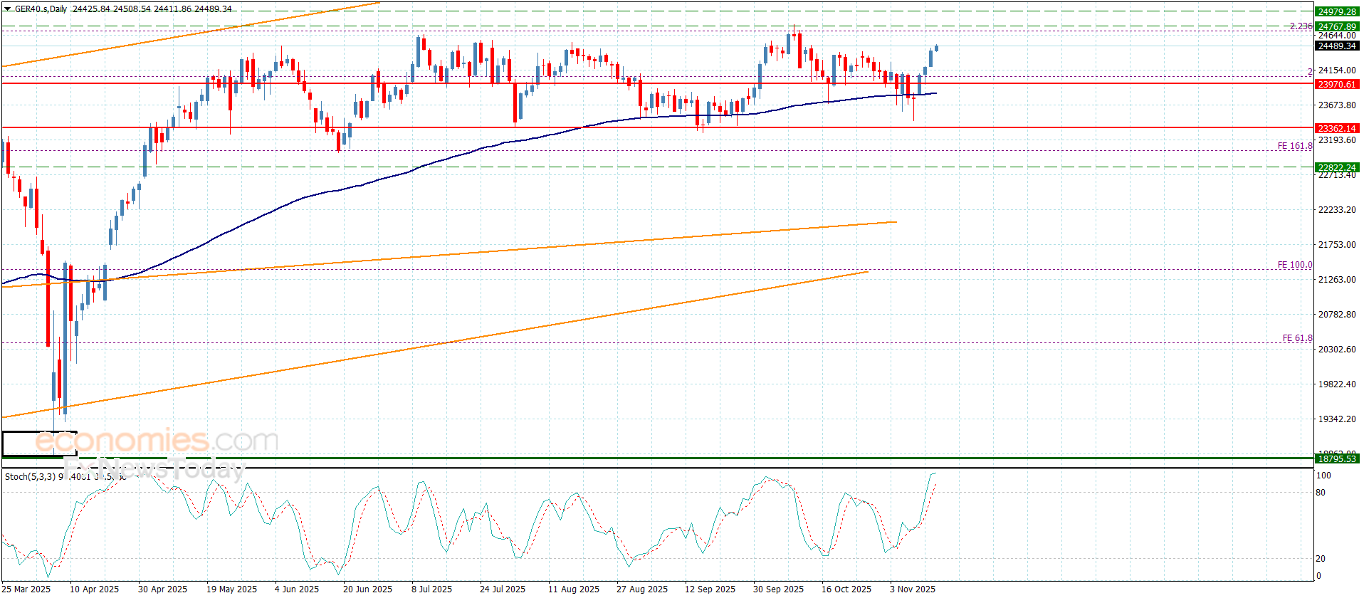 واصل سعر المؤشر تشكيله لموجات صاعدة قوية لنلاحظ وصوله حاليا نحو الحاجز الإضافي المستقر عند 24510.00 والذي شكّل بدوره الهدف المنتظر بالتقرير السابق.