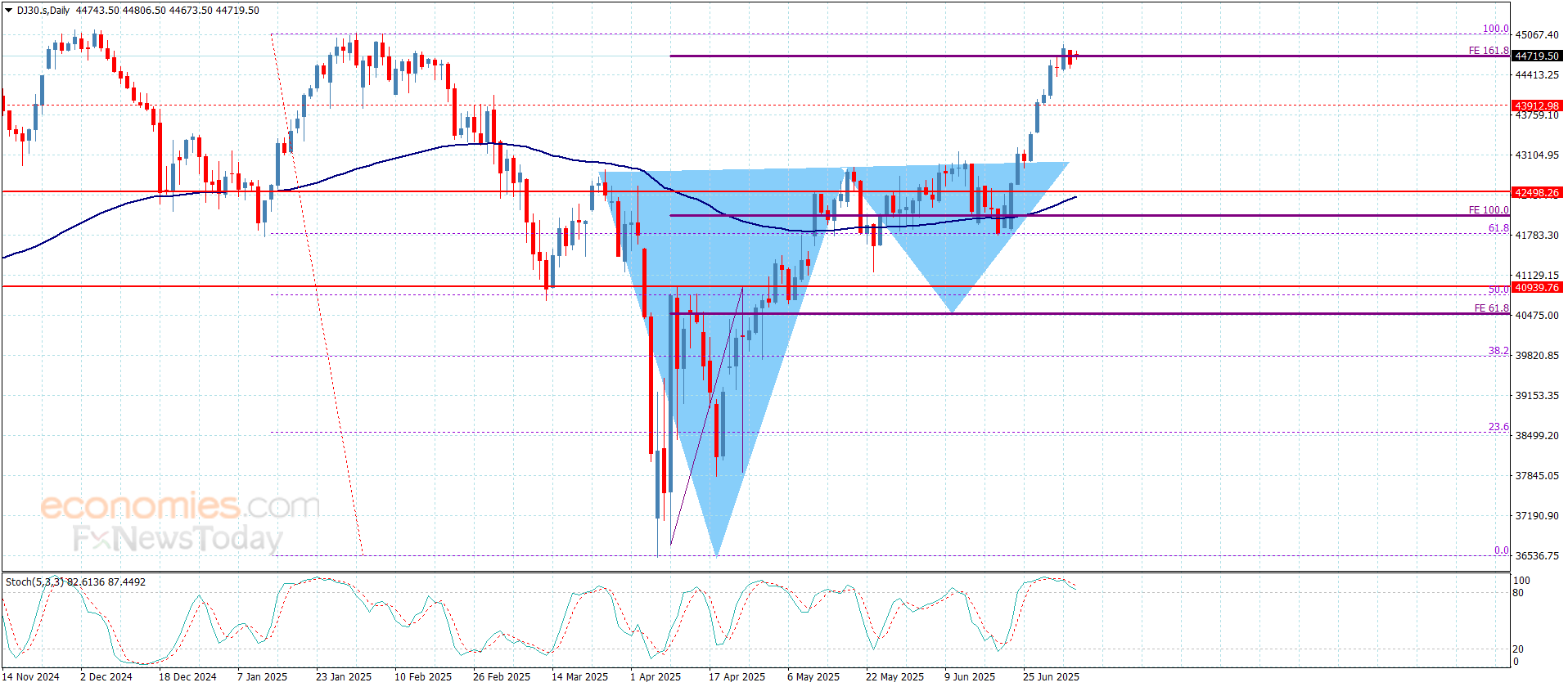 واجه سعر المؤشر صعوبة باستئنافه للهجوم الصاعد نظرا لتقديمه لإغلاقات سلبية متعددة منذ يوم الجمعة دون القمة المحققة مؤخرا لتشكيل مقاومة جديدة عند 44905 لنلاحظ تذبذبه حاليا بشكل مستمر قرب مستوى 161.8% فيبوناتشي الامتدادي والمتمثل بمستوى 44710.
