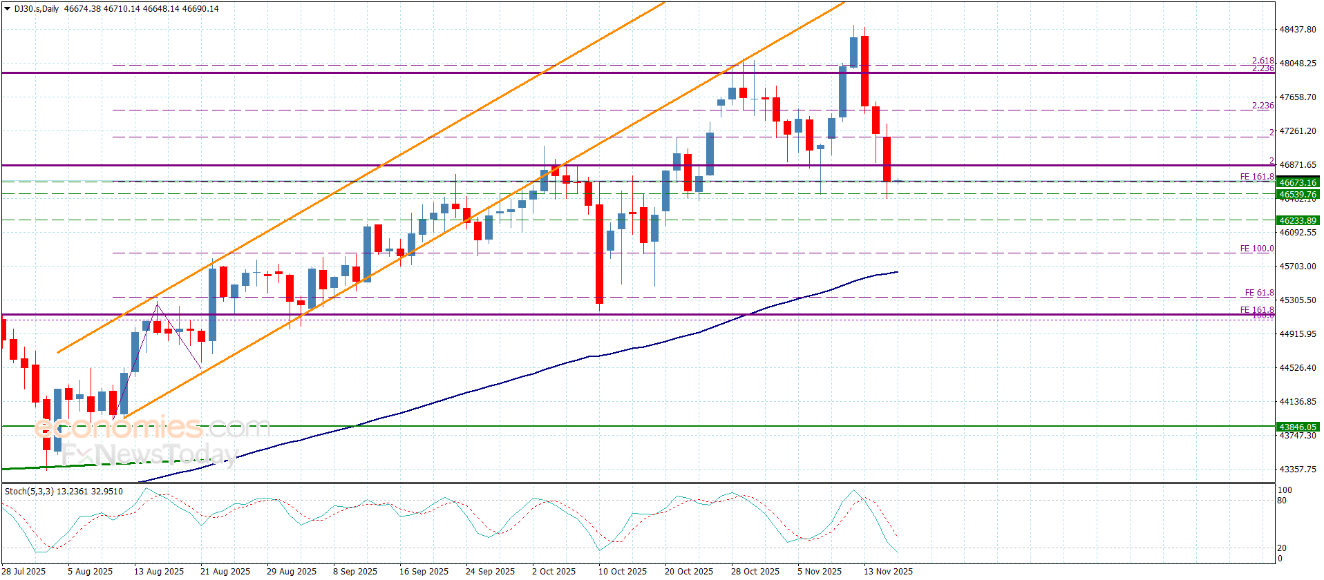 أكد سعر المؤشر استسلامه مجددا لسيطرة الميل التصحيحي الهابط بتقديمه لإغلاق سلبي جديد دون الحاجز المستقر عند 47500 لنلاحظ تشكيله لتهديد واضح لثبات مستوى 161.8% فيبوناتشي الامتدادي والمستقر عند 46680.