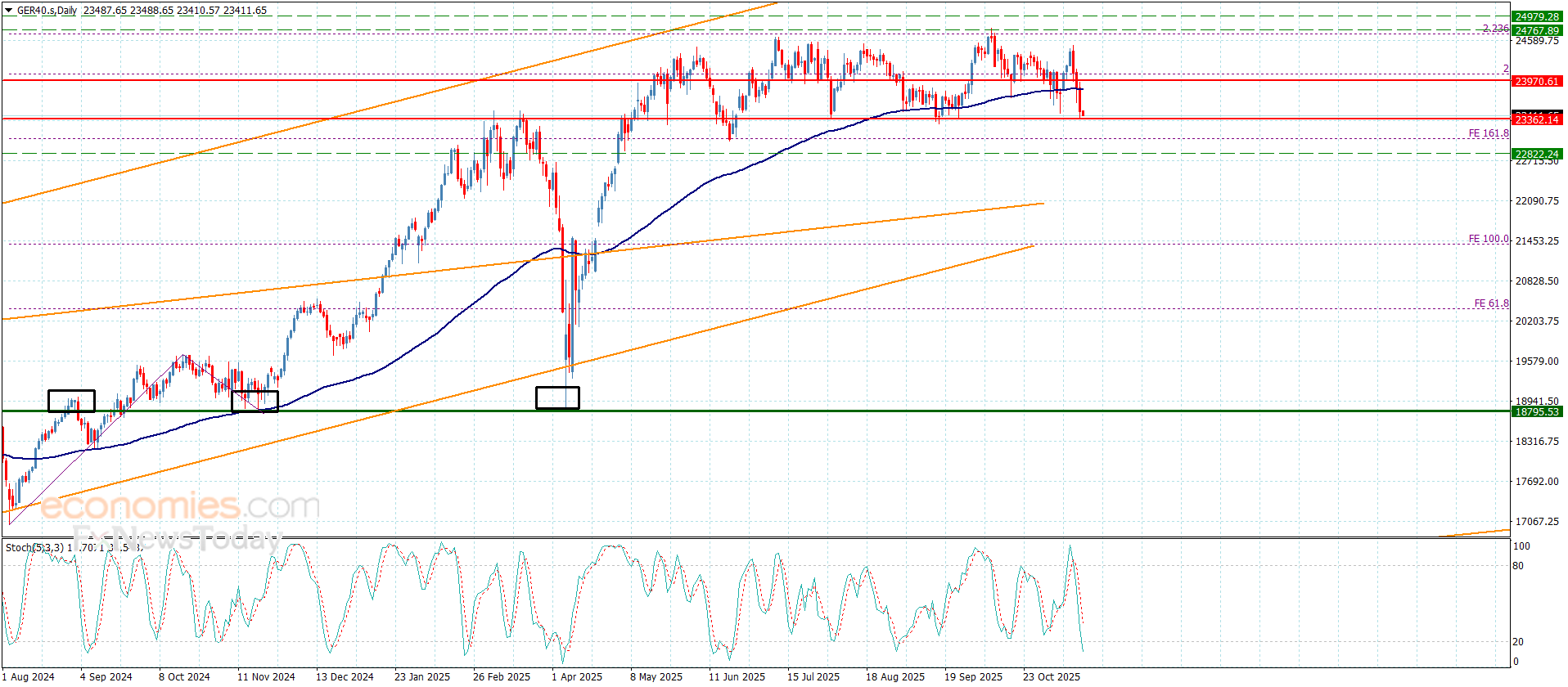 تعرض سعر المؤشر مجددا للضغوط السلبية بوصول مؤشر ستوكاستيك نحو مستوى تشبع البيع ليجبره ذلك على تشكيل تداولات تصحيحية جديدة لنلاحظ تمركزه حاليا قرب الدعم المتمركز عند 23360.00.