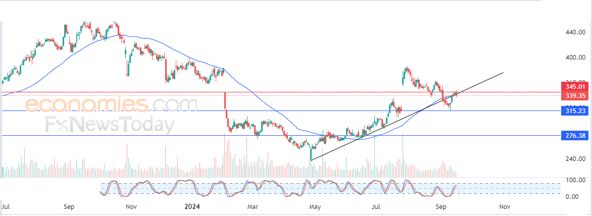 لهذا تشير توقعاتنا إلى المزيد من الهبوط لسعر السهم خلال تداولاته القادمة، طيلة ثبات مستوى المقاومة 345.00$، ليستهدف أولى مستويات الدعم عند سعر 315.00$.