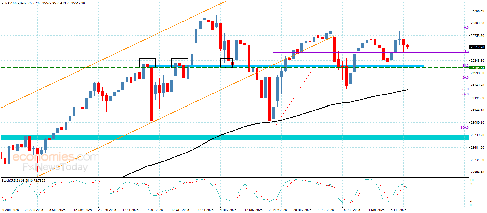يحتاج السعر حاليا لعزم إيجابي جديد ليسهل مهمة استئناف الهجوم الصاعد لنتوقع مهاجمته للمقاومة المستقرة عند 25880.00 وبتجاوزه سيبدأ بتحقيق مكاسب تاريخية جديدة بانجذابه نحو 26045.00 و26120.00 على التوالي.