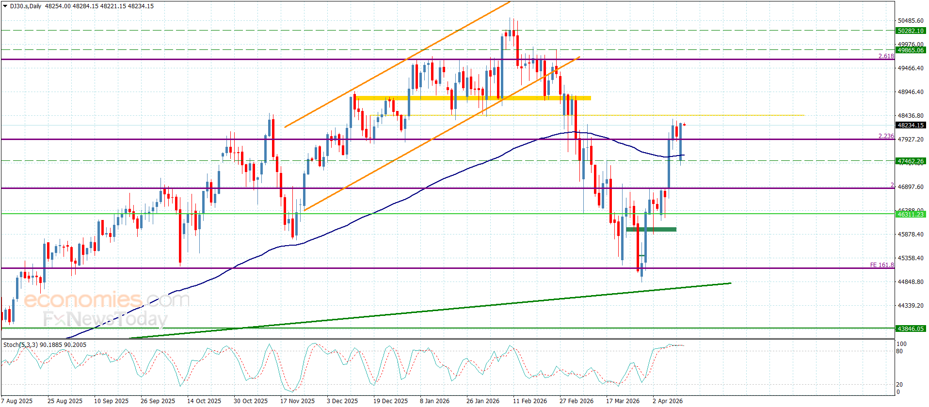 شكّل سعر المؤشر بتداولات يوم أمس اندفاع إيجابي جديد متجاوزا بذلك لمستوى 47920 لنلاحظ تسجيله لبعض المكاسب الإضافية بملامسته لمستوى 48280, نشير إلى توفر فرصة أمام السعر لتجديد المحاولات التصحيحية الهابطة باستقراره العام دون الحاجز المتمثل بمستوى 48435 لنتوقع تسلله بذلك نحو 47790 و47440 على التوالي.