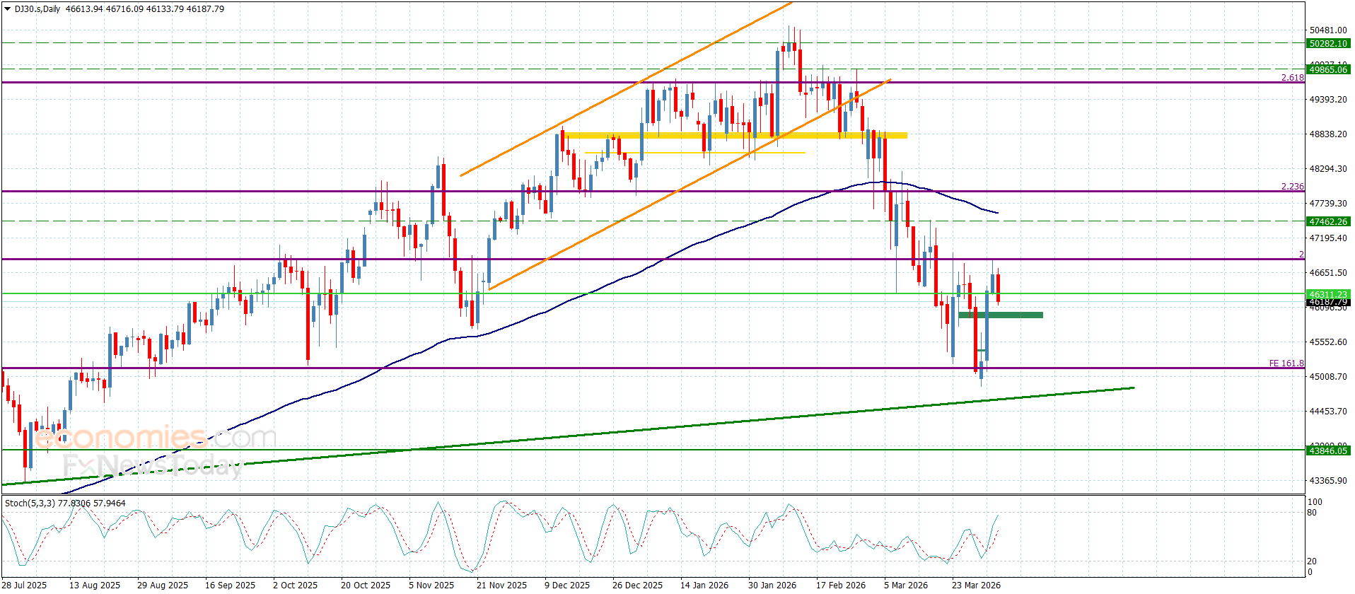 سجّل سعر المؤشر بتداولات يوم مس بعض المكاسب باندفاعه نحو 46845 ليواجه بذلك حاجز قوي متمثل بمستوى 2.00% فيبوناتشي الامتدادي ليجبره ذلك على تفعيل الهجوم السلبي لنلاحظ تسلله حاليا نحو 46150.