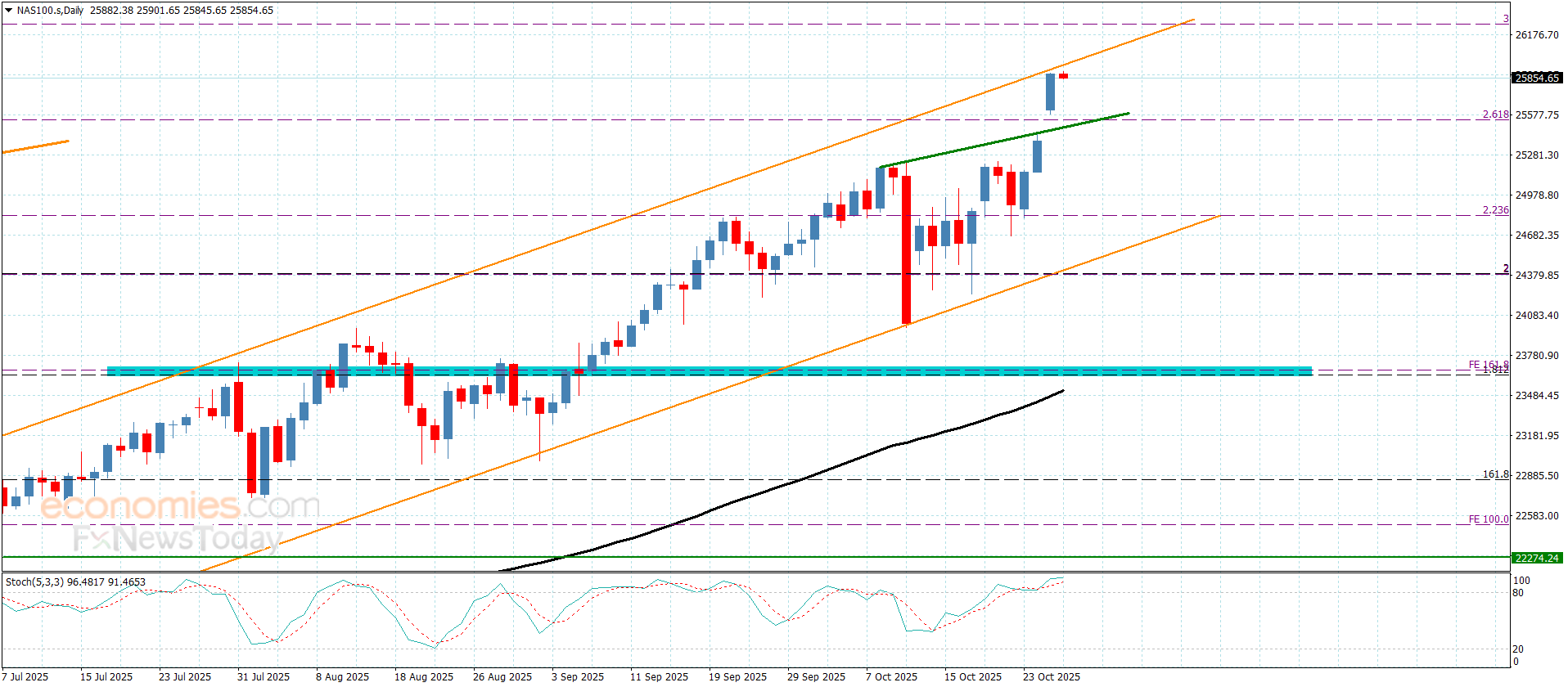 واصل سعر المؤشر منذ تداولات يوم أمس تشكيله لموجات صاعدة قوية محققا بذلك لمكاسب تاريخية جديدة بملامسته لمستوى 25900.00 ليسجل بذلك بعض الأهداف المقترحة سابقا.