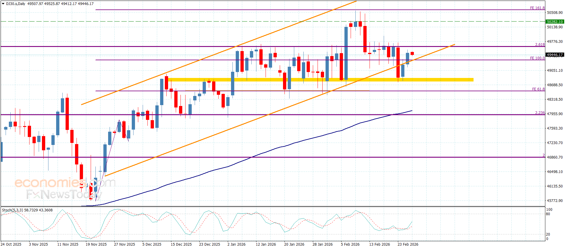 نجح سعر المؤشر بتداولات يوم أمس بتسجيله لبعض المكاسب الإضافية باندفاعه فوق مستوى 49330 لنلاحظ اندفاعه نحو 49573 ليحافظ على تمركزه دون الحاجز الإضافي المستقر قرب 49650.