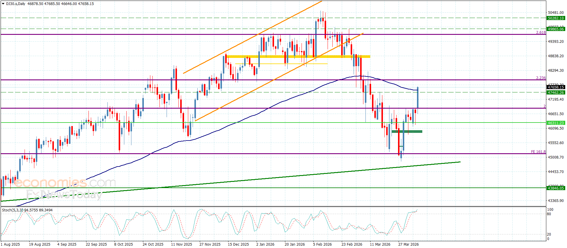 بدأ سعر المؤشر تداولات هذا الصباح بإيجابية قوية متأثرا بالقرارات الامريكية المحدثة لنلاحظ اندفاعه فوق الحاجز المتمثل بمستوى 46845 ليبدأ بتشكيل موجات صاعدة قوية وليسجل العديد من المكاسب بوصوله نحو 47680.