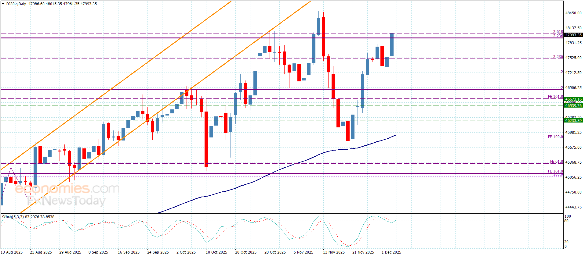 نجح سعر المؤشر بتأكيد السيناريو الإيجابي المقترح سابقا لنلاحظ تشكيله لاندفاع صاعد قوي متجاوزا بذلك للعائق المستقر عند 47775 وتحقيقه للأهداف المقترحة سابقا بملامسته لمستوى 48070.