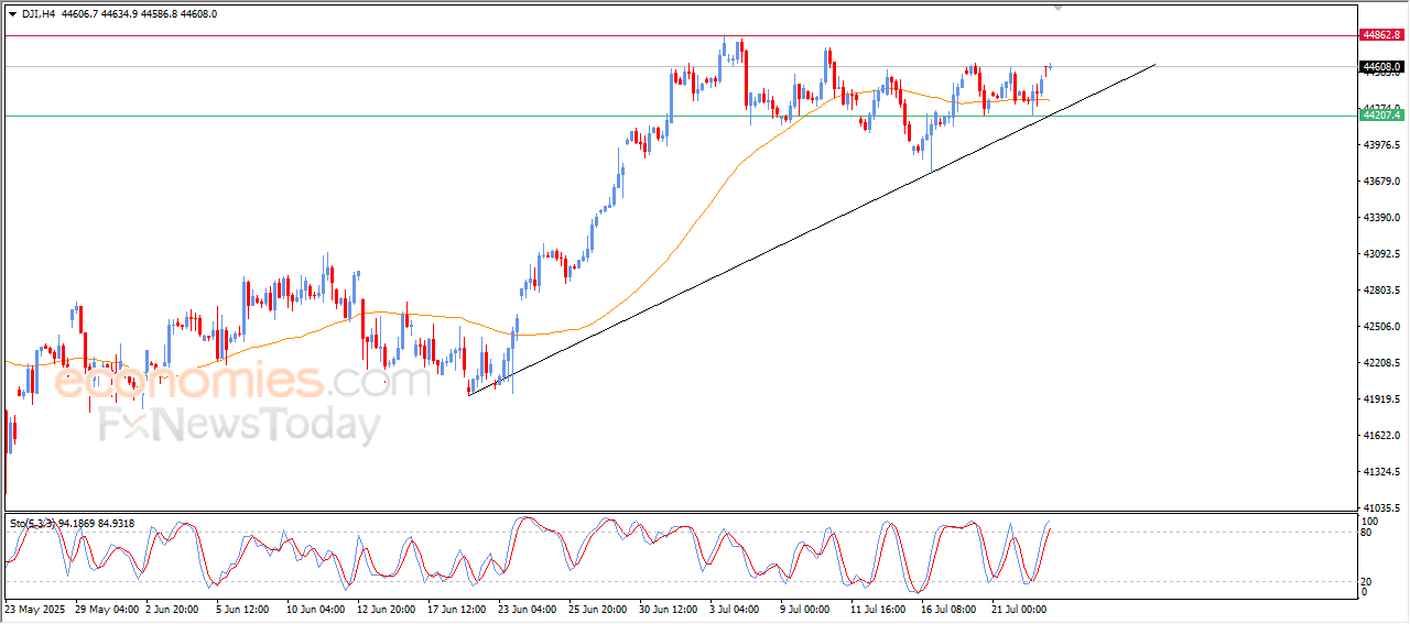 على هذا الأساس فتوقعاتنا تشير إلى صعود مؤشر داو جونز خلال تداولاته اللحظية القادمة، طيلة ثبات الدعم 44,200، ليستهدف مستوى المقاومة المحوري 44,860.