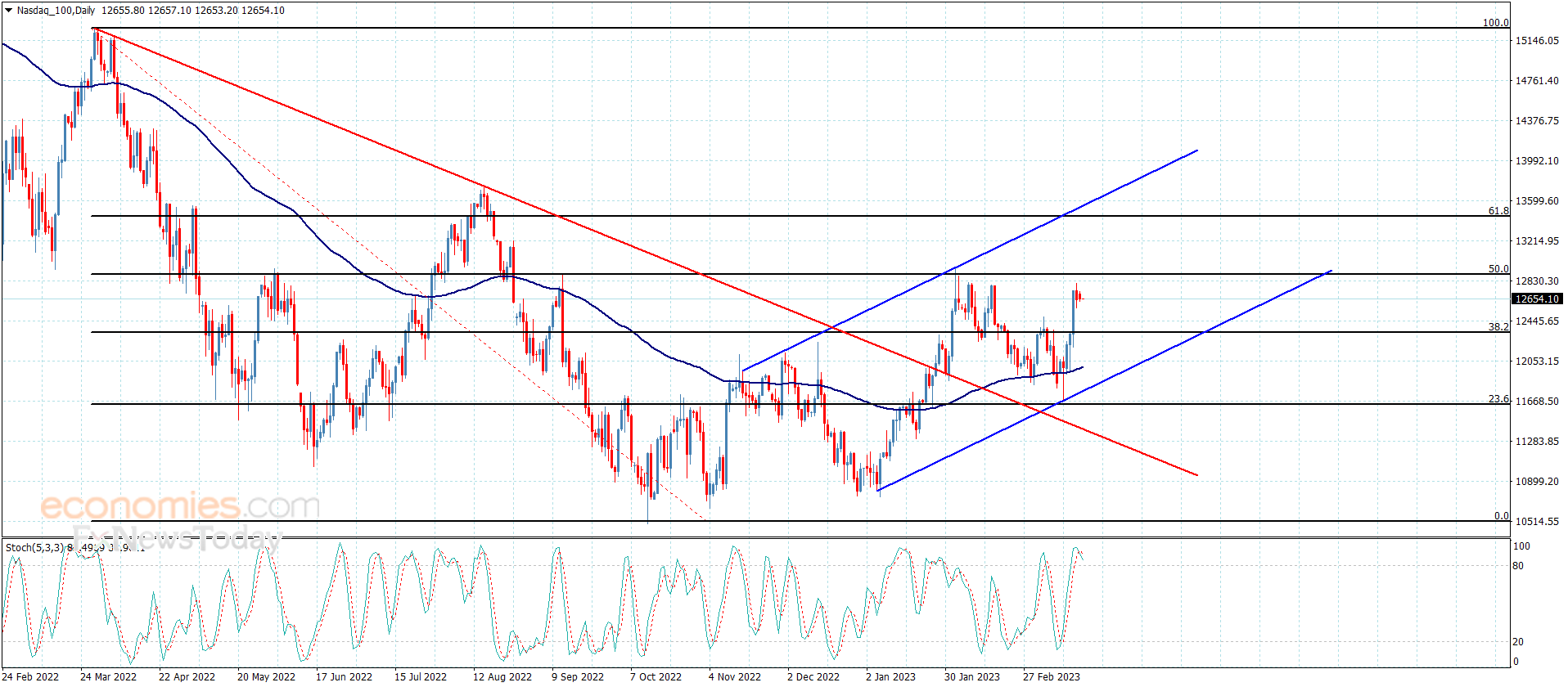 قدم سعر المؤشر إغلاق إيجابي جديد ضمن محاور القناة الصاعدة مستغلا ثبات الدعم الإضافي المتمركز عند 12355.00 لنلاحظ تسجيله مؤخرا لمكاسب إضافية بملامسته لمستوى 12810.00.