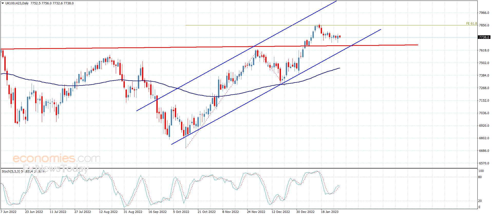 نلاحظ من الرسم المرفق بدء تشكيل مؤشر ستوكاستيك لموجه صاعدة ليتجاوز بذلك مستوى 50 وليمنح السعر فرصة لتجميع العزم الإيجابي من جديد ليدعونا ذلك للتمسك بالترجيح الصاعد ليستهدف قريبا مستوى 7800.00 ومن ثم ليحاول اختراق العائق المستقر عند 7860.00 ليمكنه ذلك من تحقيق مكاسب جديدة خلال الفترة القادمة.