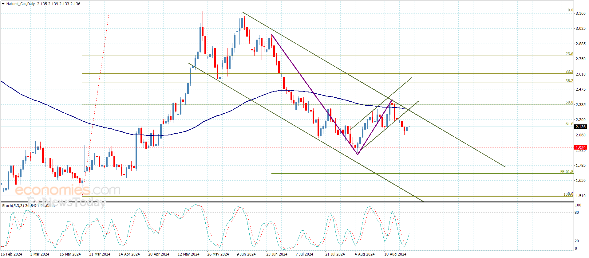 أكد سعر الغاز استسلامه لسيطرة الميل الهابط بتشكيله مؤخرا لقناة هابطة جديدة لنعتمد على ثبات المقاومة الرئيسية الممتدة نحو 2.285$ لتفعيل الهجوم السلبي من جديد.
