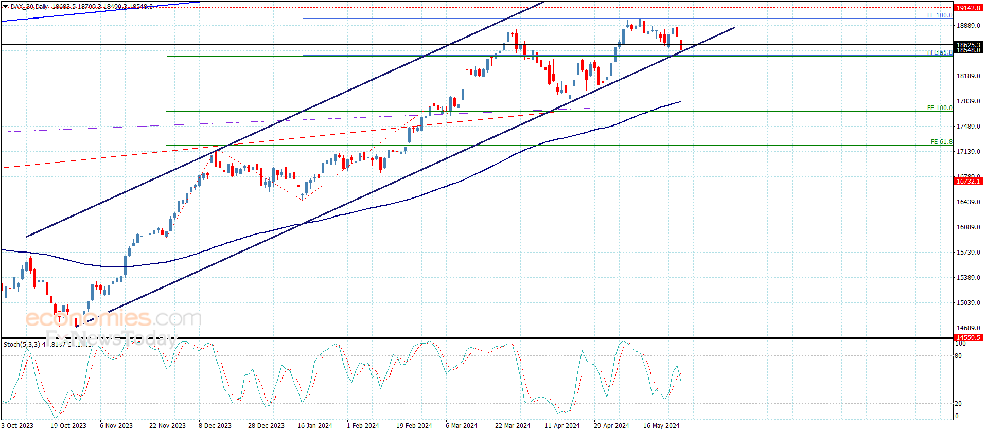 - أدى افتقار سعر المؤشر للعزم الإيجابي بشكل مستمر لتشكيل بعض الموجات السلبية المؤقتة لنلاحظ وصوله حاليا نحو دعم القناة الصاعدة الممتد نحو 18560.00 والاستقرار قربه.