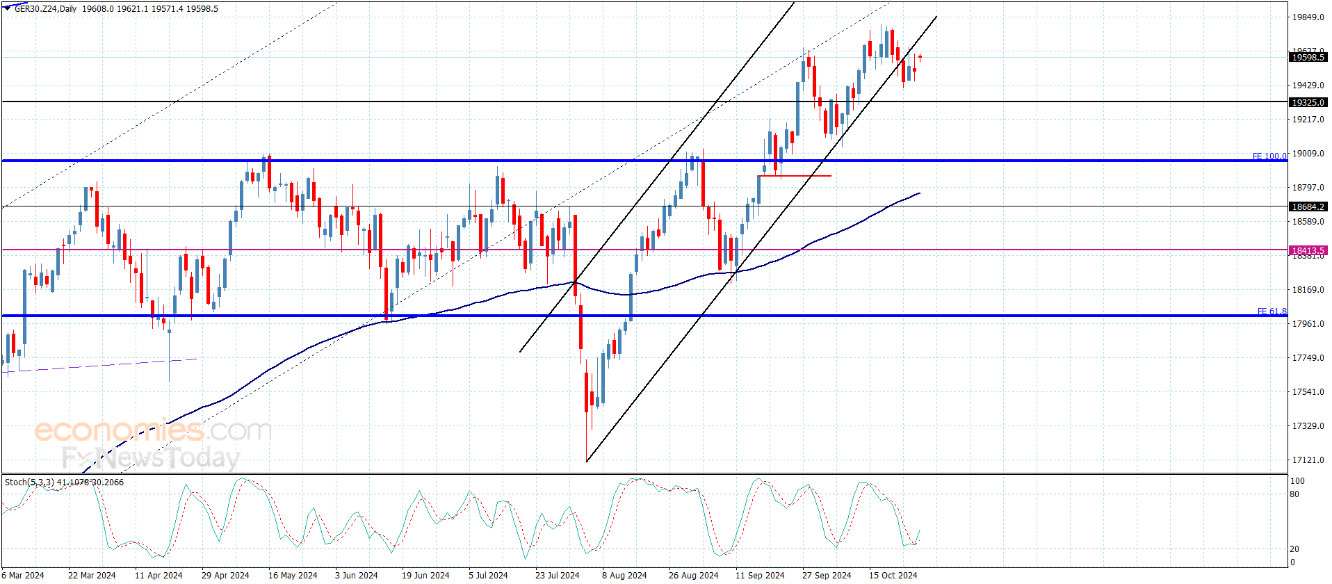 نلاحظ من الرسم المرفق استمرار تذبذب مؤشر ستوكاستيك دون مستوى 50 ليزيد بدوره فرص اكتساب السعر للعزم السلبي وليدعونا لانتظار استهدافه قريبا للمحطات السلبية المستقرة عند 19325.00 و19220.00 على التوالي.