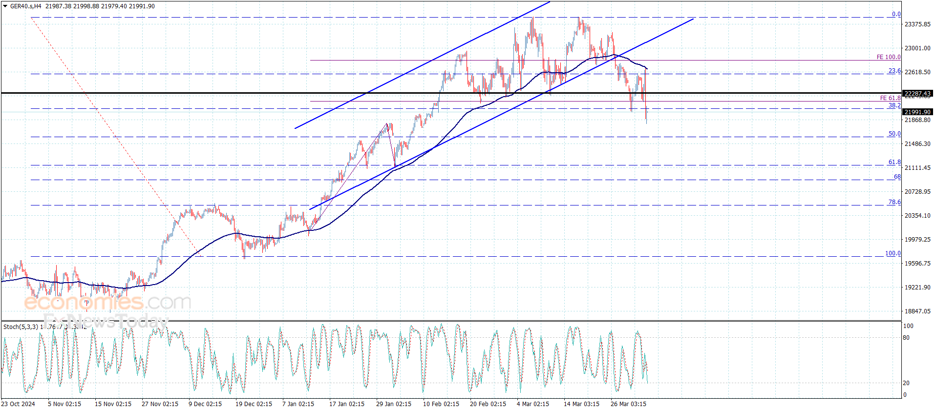 أنهى سعر المؤشر الاندفاع الصاعد الأخير بمواجهته لمحور المتوسط المتحرك 55 المتمركز عند 22685.00 ليشكل بدوره عائق قوي أمام المحاولات الصاعدة ليضطر بعد ذلك للتفاعل مع الضغوط السلبية بتشكيله لهبوط حاد متجاوزا بذلك مستوى 22155.00 لنلاحظ تكبده لخسائر جديدة بوصوله نحو 21800.00.