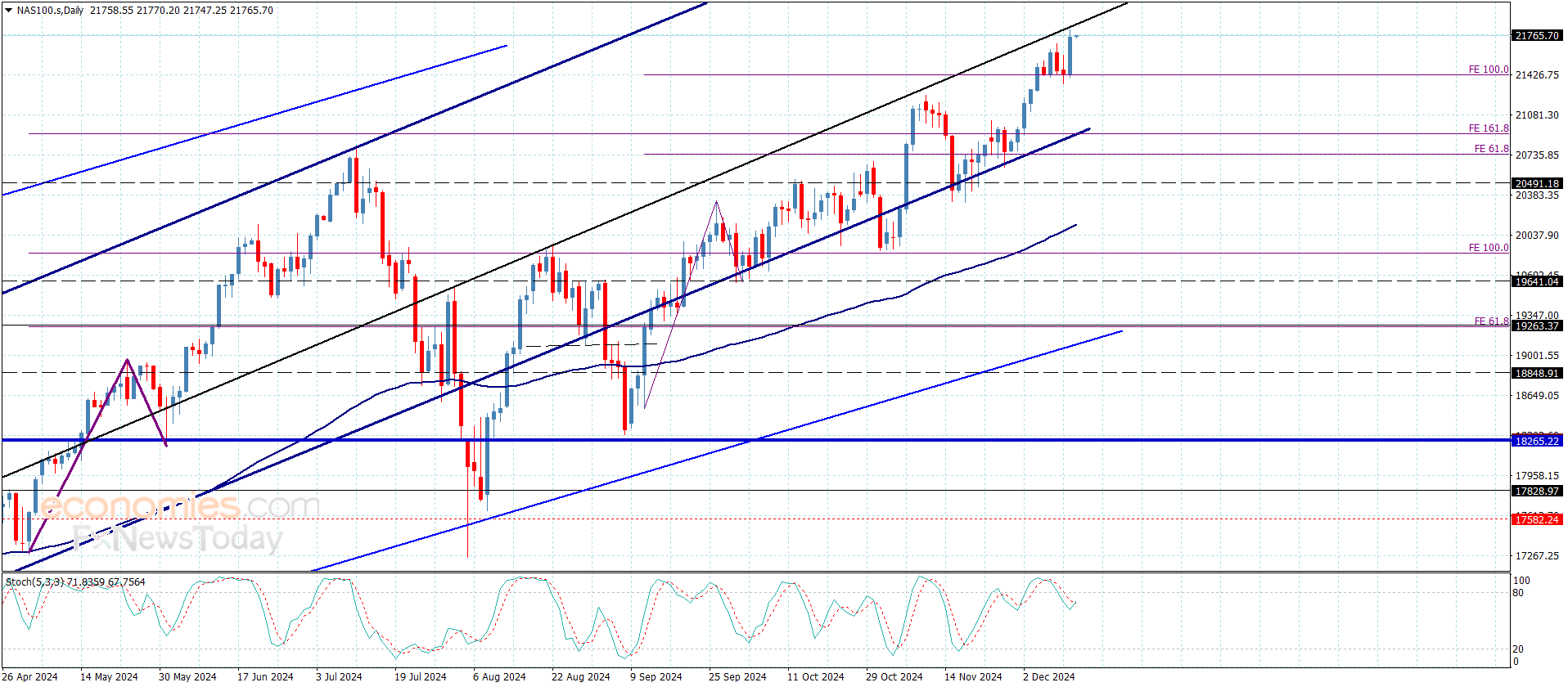 فشل سعر المؤشر بتفعيل المسار التصحيحي الهابط بثباته يوم أمس فوق الدعم المستقر عند 21410.00 لنلاحظ تشكيله لاندفاع صاعد قوي مسجلا بذلك المزيد من المكاسب التاريخية الجديدة بملامسته لمستوى 21818.00 ليواجه بذلك امتداد لمقاومة تاريخية قوية كما هو واضح بالرسم المرفق.