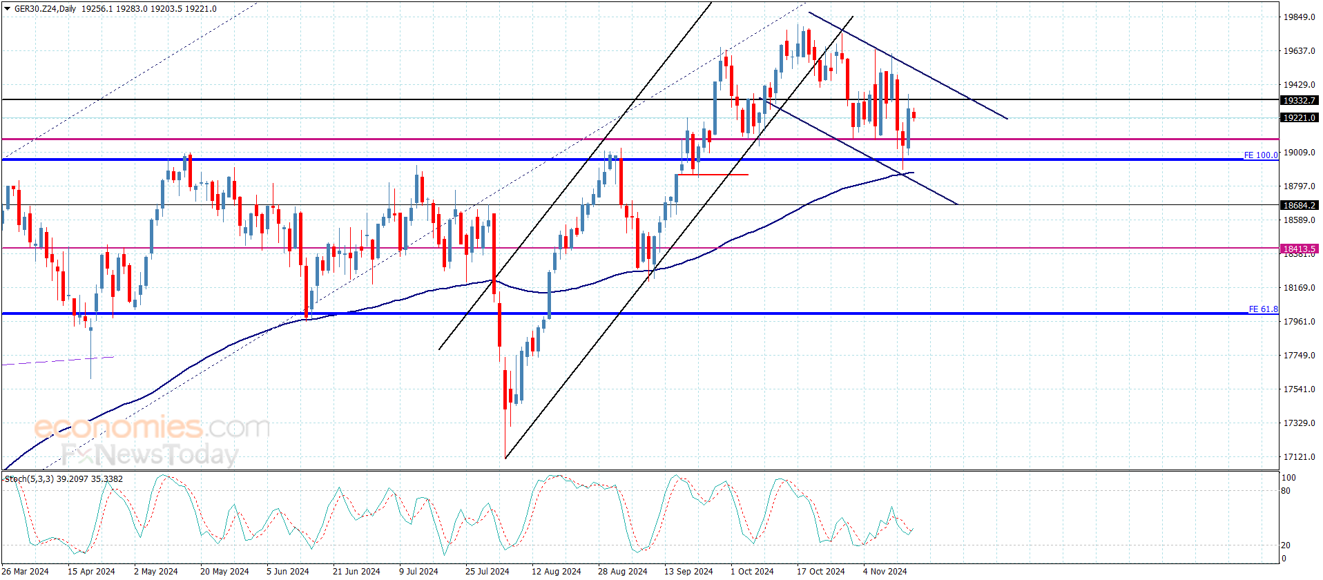 استغل سعر المؤشر بتداولات يوم أمس تقديم مؤشر ستوكاستيك للعزم الإيجابي ليشكل ارتداد صاعد قوي باستهدافه لمستوى 19370.00 ومن ثم ليرتد مباشرة بشكل سلبي نحو 19200.0.