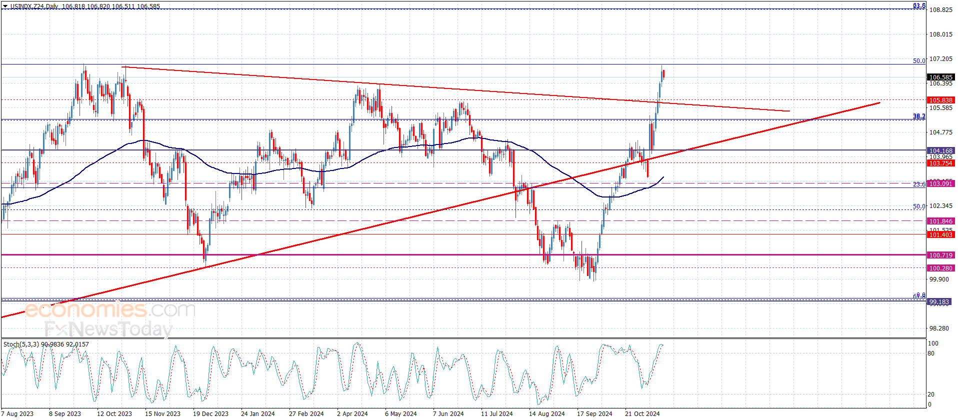 استأنف سعر المؤشر يوم أمس تشكيله لتداولات صاعدة قوية ليلامس الهدف المستقر عند 106.97 والذي يشكل بدوره مستوى تصحيح 50% فيبوناتشي ليضطر لتشكيل ارتداد سلبي واضح باستقراره حاليا قرب 106.50.