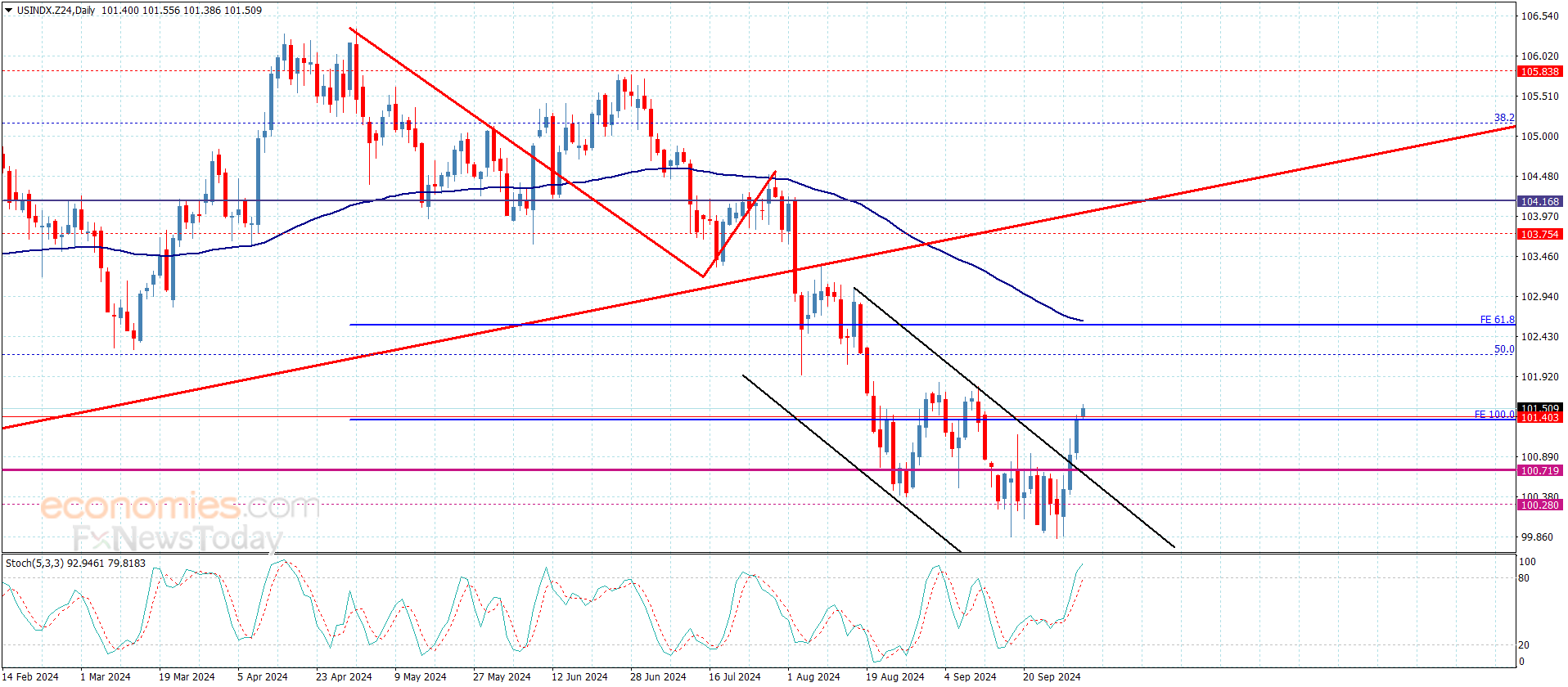 أكد سعر المؤشر انتقاله للمسار الصاعد بثباته مؤخرا فوق الدعم المتمركز عند 100.70 لنلاحظ تشكيله لاندفاع صاعد قوي متجاوزا بذلك للحاجز المستقر عند 101.40 والذي شكّل مؤخرا الهدف الأول للمسار الصاعد.
