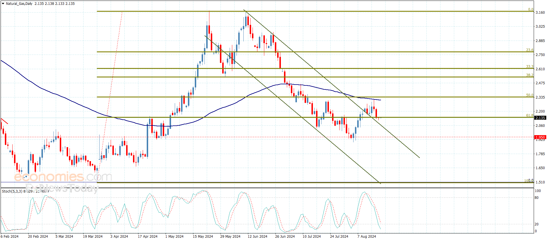 بالرغم من ضعف تداولات سعر الغاز الأخيرة وتذبذبه قرب 2.130$ إلا أن صموده حتى هذه اللحظة فوق مقاومة القناة الهابطة المخترقة والتي تشكل بدورها حاليا دعم مهم عند 2.080$ فإن ذلك يدعونا للتمسك بالترجيح الصاعد المقترح سابقا.
