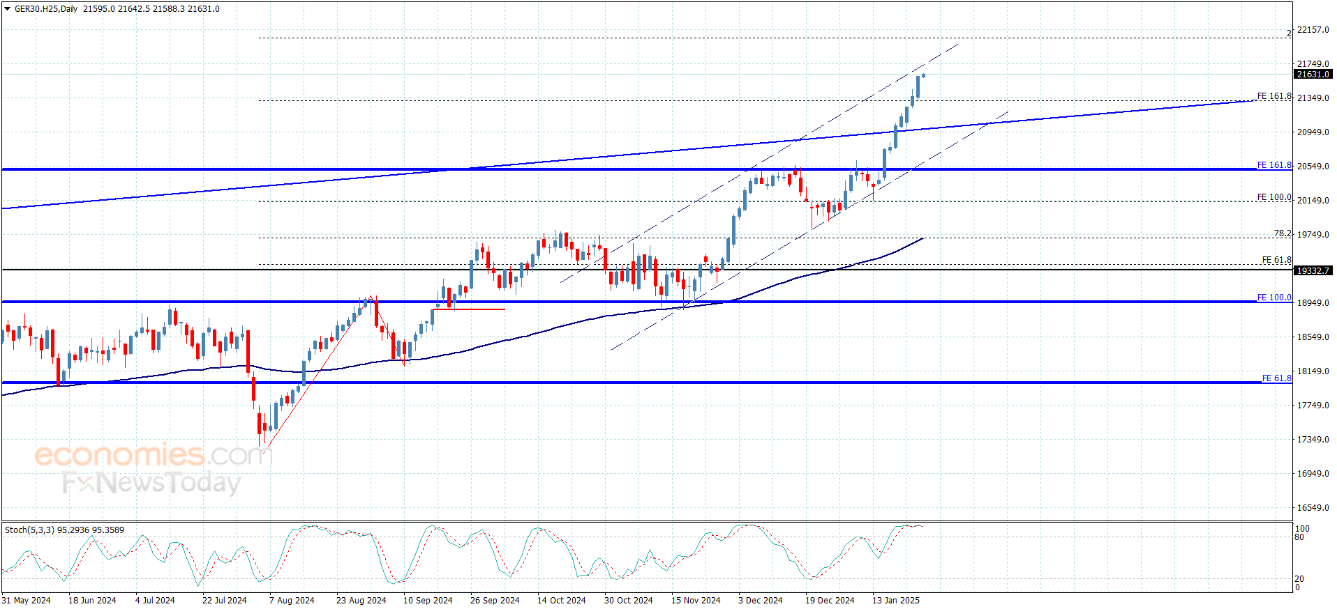 استأنف سعر المؤشر الاندفاع الصاعد محققا بذلك مكاسب تاريخية جديدة مقتربا بذلك من الهدف المقترح سابقا والمتمركز عند 21680.00, نشير إلى أن تذبذب مؤشر ستوكاستيك ضمن مستوى تشبع الشراء قد يجبر السعر على تقديم بعض التداولات الجانبية لحين تجميعه للعزم الإيجابي الإضافي ليمكنه ذلك بتجاوز قمة القناة الفرعية الصاعدة والممتدة نحو 21740.00 ومن ثم ليحاول ملامسة الهدف الرئيسي التالي المستقر عند 22050.00.