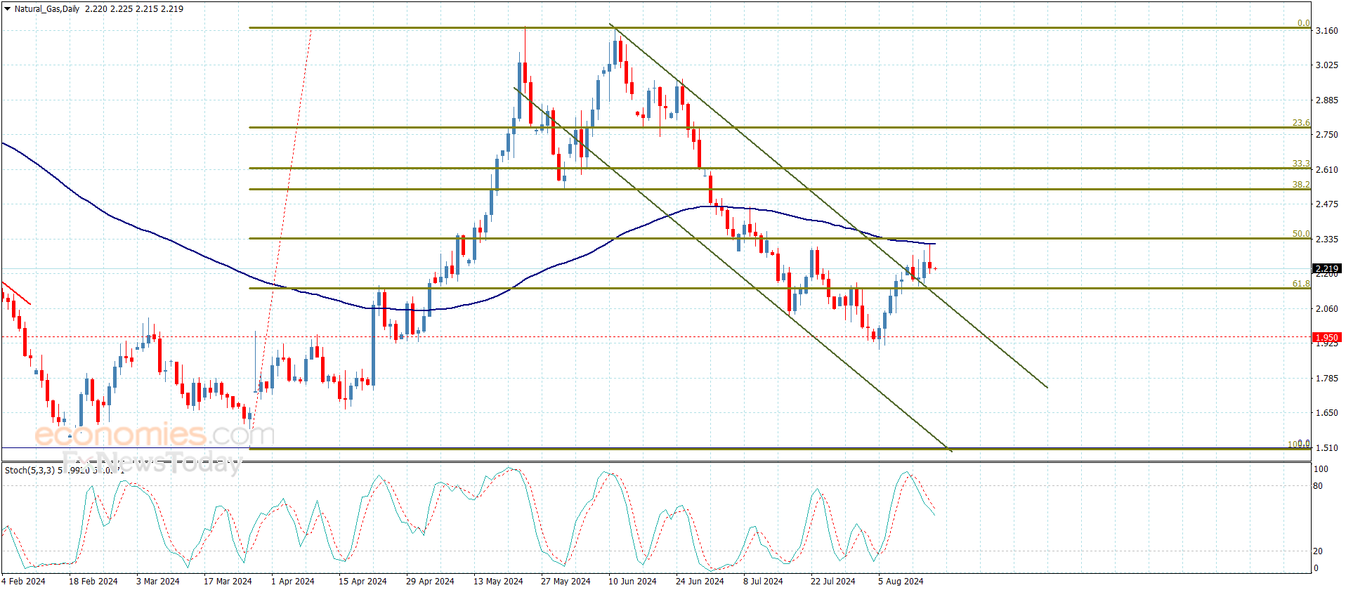 اقترب سعر الغاز باندفاعه الصاعد الأخير من الهدف الأول المتمركز عند 2.340$ ليواجه محور المتوسط المتحرك 55 لنلاحظ تشكيله لارتداد تصحيحي هابط مؤقت بتسلله نحو 2.190$.