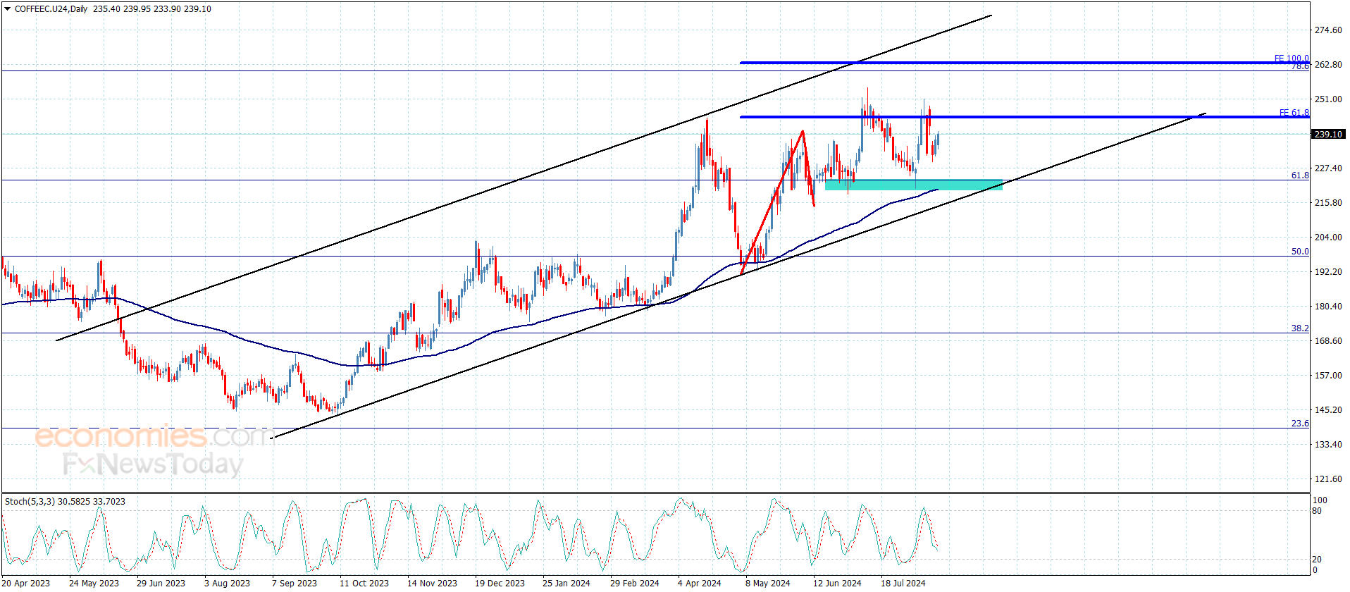 اضطر سعر القهوة مؤخرا لتشكيل بعض الموجات التصحيحية الهابطة نتيجة لتعرضه لبعض الضغوط السلبية بهبوط مؤشر ستوكاستيك دون مستوى 50 لنلاحظ تكبده لبعض الخسائر بتسلله نحو 230.00 ومن ثم ليبدأ بتشكيل بعض الموجات الإيجابية ليستقر حاليا قرب 239.10.