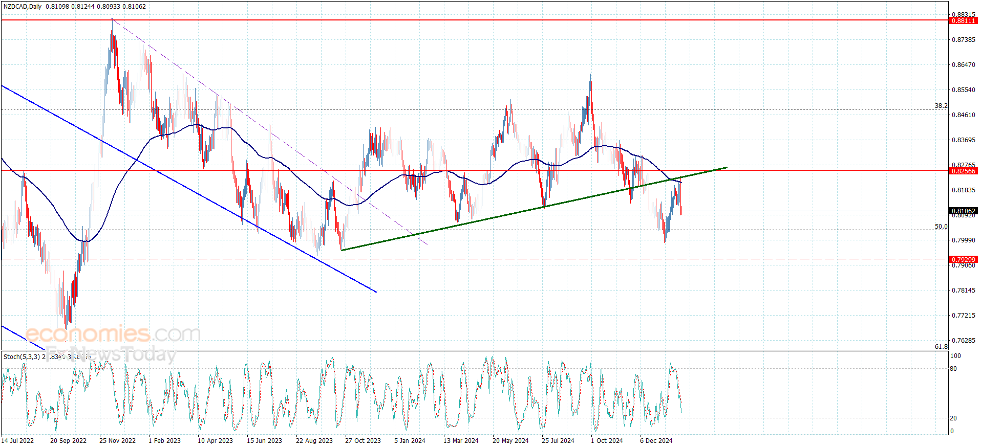 تمركز المتوسط المتحرك 55 دون المقاومة المذكورة سابقا وبمحاولة تقديم مؤشر ستوكاستيك للعزم السلبي باقترابه من مستوى 20 نتوقع تأثر السعر بضغوط سلبية جديدة ليستمر بالهبوط لحين وصوله نحو مستوى تصحيح 50% فيبوناتشي المستقر عند 0.8035.