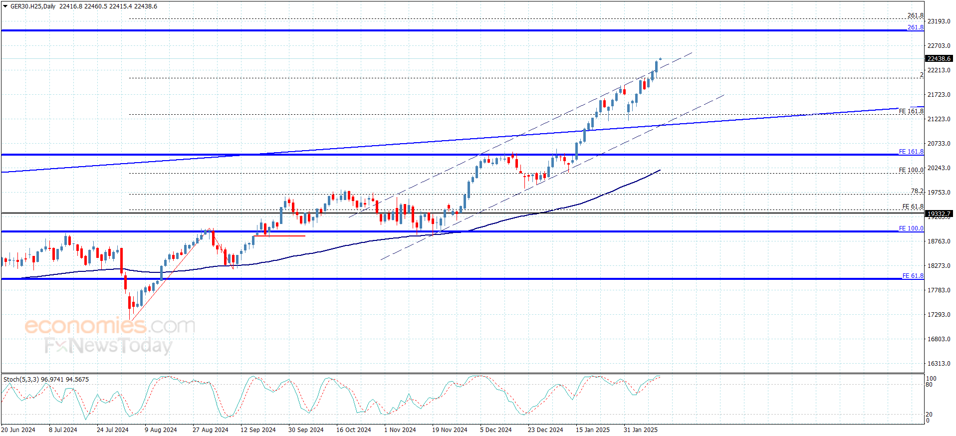 نجح سعر المؤشر باستغلال الضغوط الإيجابية بتجاوزه لمقاومة القناة الفرعية الصاعدة المتمركزة عند 22200.00 لنلاحظ تحقيقه بذلك لمكاسب تاريخية جديدة باستقراره حاليا قرب 22435.00.