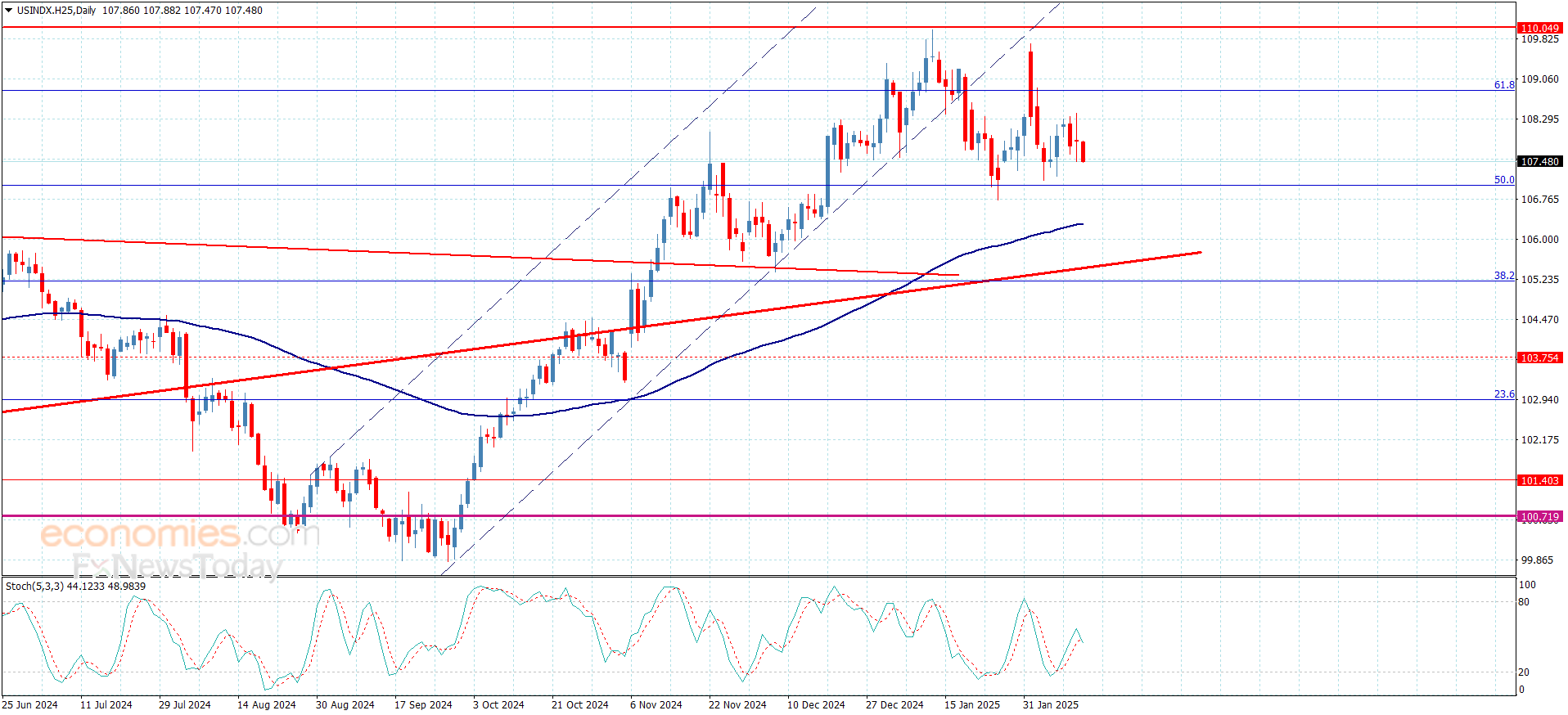فشل سعر المؤشر يوم أمس بتجاوز الهدف الإيجابي المستقر عند 108.45 ليشكل ذلك حاجز قوي أمامه وليجبره على تفعيل المسار التصحيحي الهابط لنلاحظ وصوله حاليا نحو 107.50.