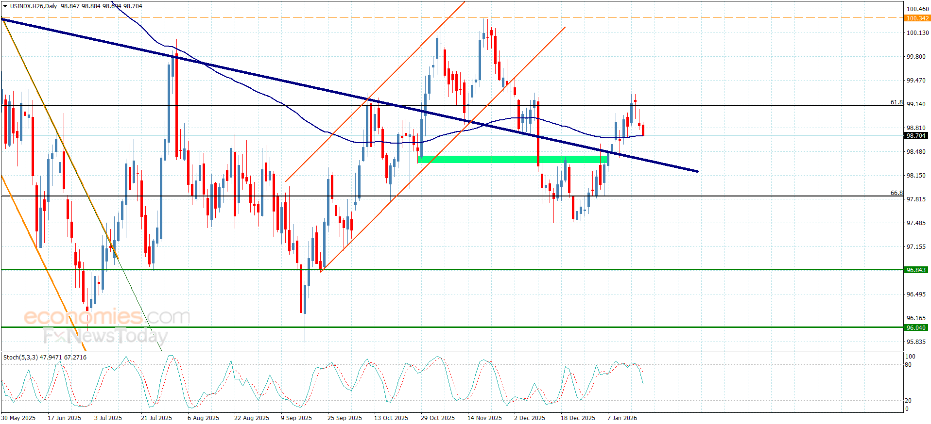 أنهى سعر المؤشر التداولات الأخيرة بتقديمه لإغلاق سلبي دون مستوى تصحيح 61.8% فيبوناتشي والذي يشكل بدوره حاجز قوي عند مستوى 99.10 ليجبره ذلك على تشكيل تداولات سلبية لحظية بتسلله حاليا نحو 98.65 مواجها بذلك محور المتوسط المتحرك 55.