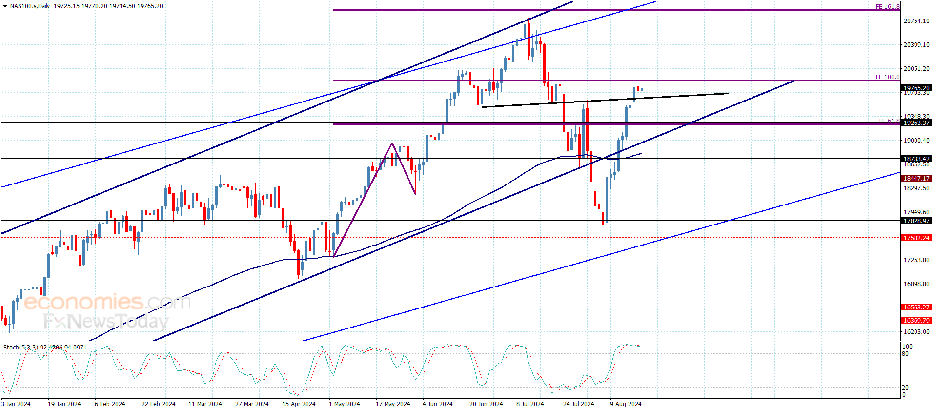 لامس سعر المؤشر بتداولات يوم أمس مستوى 19855.00 ومن ثم ليشكل ارتداد سلبي مؤقت متأثرا بثباته دون الحاجز المستقر عند 19800.00 إضافة لمحاولة خروج مؤشر ستوكاستيك من مستوى تشبع الشراء.