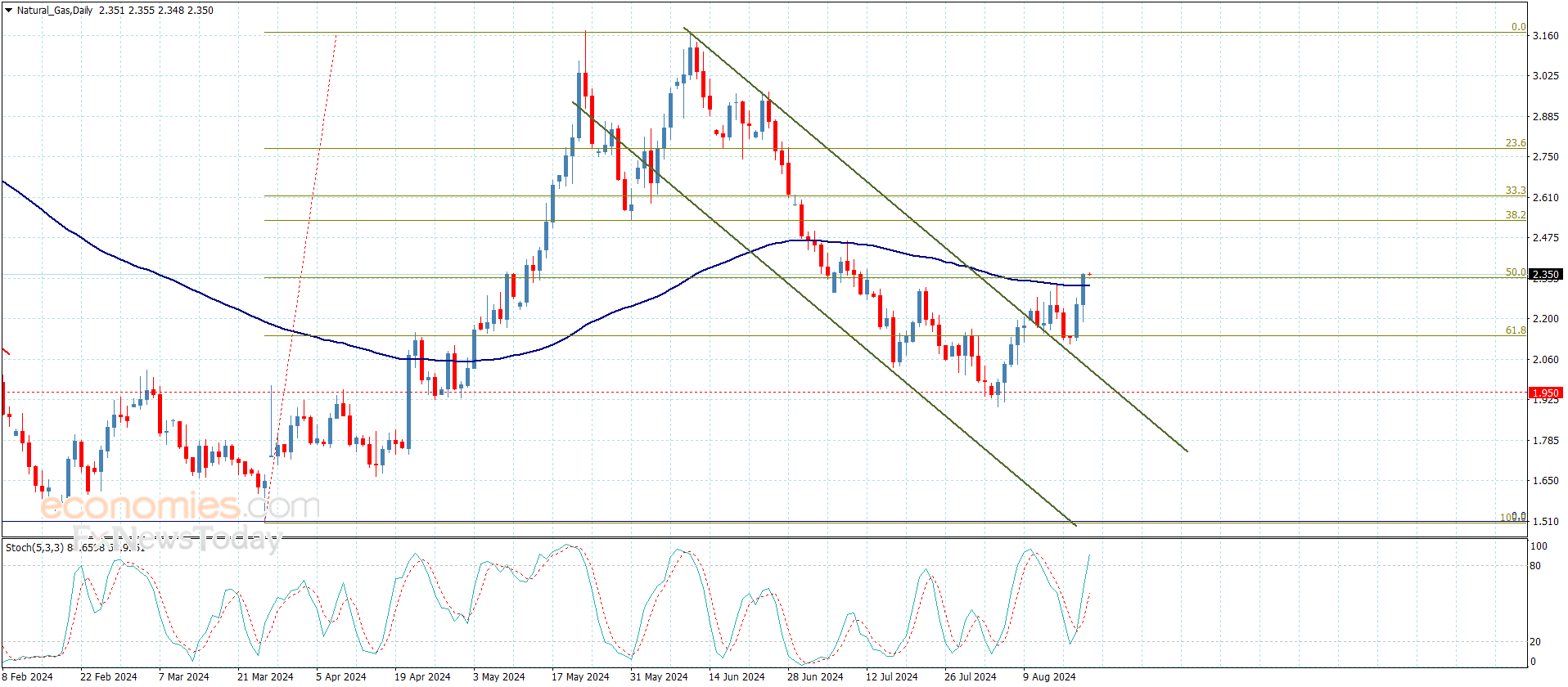 أكد سعر الغاز تأثره بسيطرة الميل الصاعد باندفاعه يوم أمس فوق محور المتوسط المتحرك 55 المستقر عند 2.305$ ليتجاوز بذلك مستوى تصحيح 50% فيبوناتشي المتمركز عند 2.340$ وليستقر أعلاه.